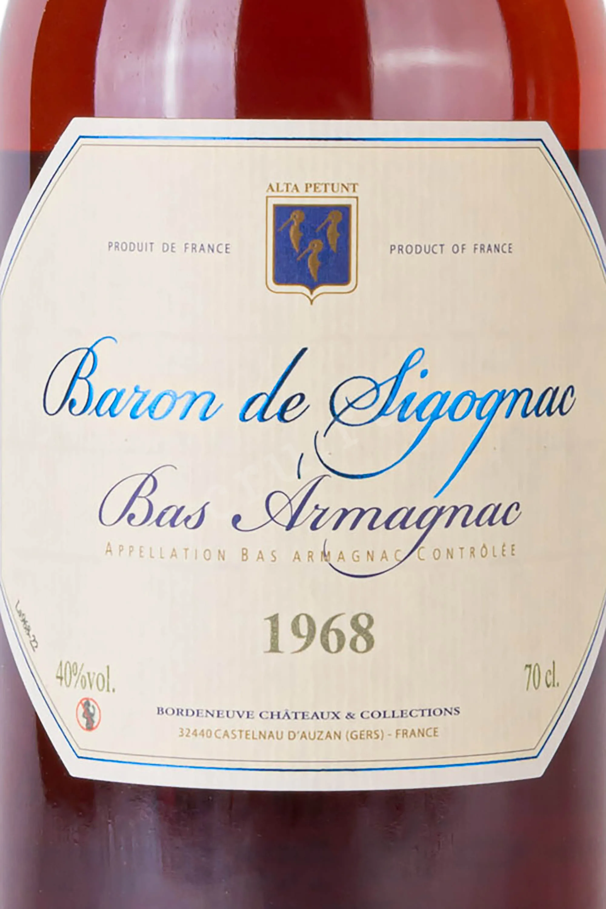 Арманьяк Baron de Sigognac 1968 г. 0,7 л в деревянной упаковке изготовлен из классических для Гаскони белых сортов винограда. Терруар Ба-Арманьяка, что на юго-западе Франции, славится песчано-глинистыми почвами с примесью железа, создающими идеальные условия для выращивания лоз. На создание напитка пошли урожаи одного года сбора. Винтаж отличался умеренно тёплой весной и прохладным летом с чередой солнечных дней в сентябре. Это позволило плодам медленно вызреть и накопить сложные ароматические соединения. Белое сухое вино, полученное из виноградного сока путем брожения, дистиллировали в медных аламбиках в течение зимы 1968–1969 годов, а далее последовала долгая, более 50 лет, выдержка в бочках из гасконского дуба. За это время дистилляты приобрели глубокую структуру, сохранив при этом чистоту вкуса и тонкую, развитую ароматическую палитру. Винтажный бренди бутилировали вручную без холодной фильтрации.