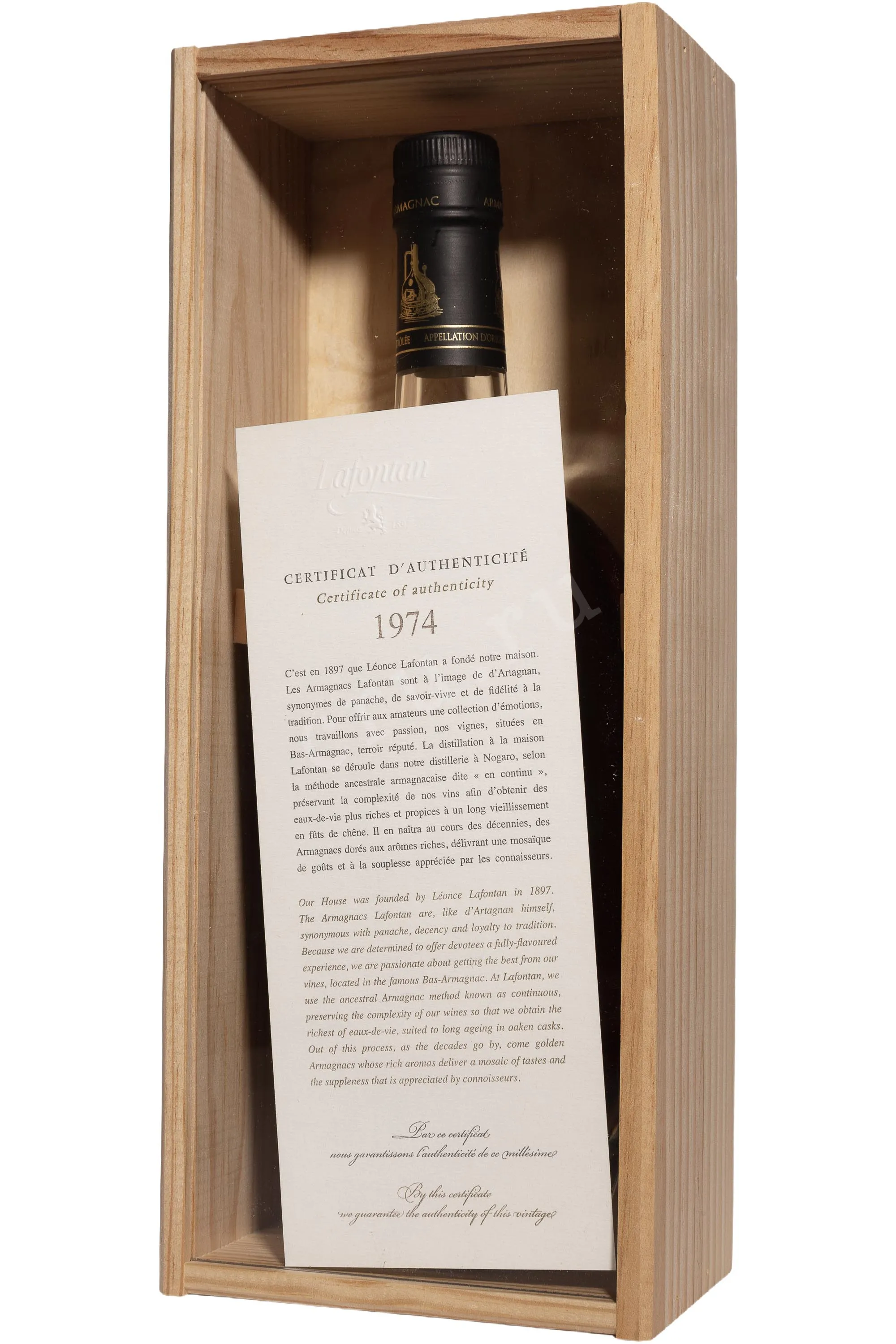Арманьяк Lafontan Millesime 1974 год 0.7 л — винтажный французский алкоголь, созданный в регионе Гасконь. Он произведён из винограда, выращенного в зоне Бас-Арманьяк, где преобладают песчано-глинистые почвы. Перегонка проводилась в медных аламбиках с низкой температурой, что помогло сохранить ароматическую насыщенность. Выдержка осуществлялась в бочках из черного гасконского дуба. Возраст спиртов — не менее 51 года. Дом Лафонтан известен традиционными методами производства без добавления карамели и сахара. Миллезим 1974 года ценится коллекционерами и экспертами за гармоничное развитие вкуса и редкую глубину букета. Редкий алкоголь в стильном деревянном ящичке станет отличным подарком по особому поводу.