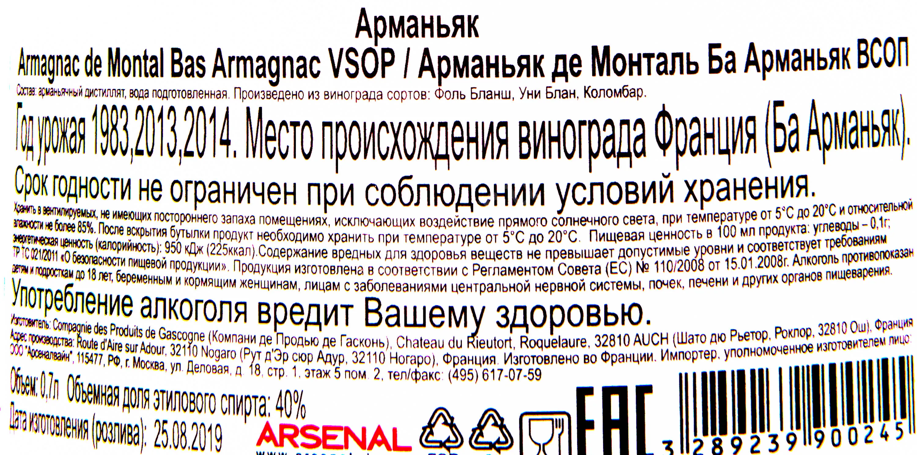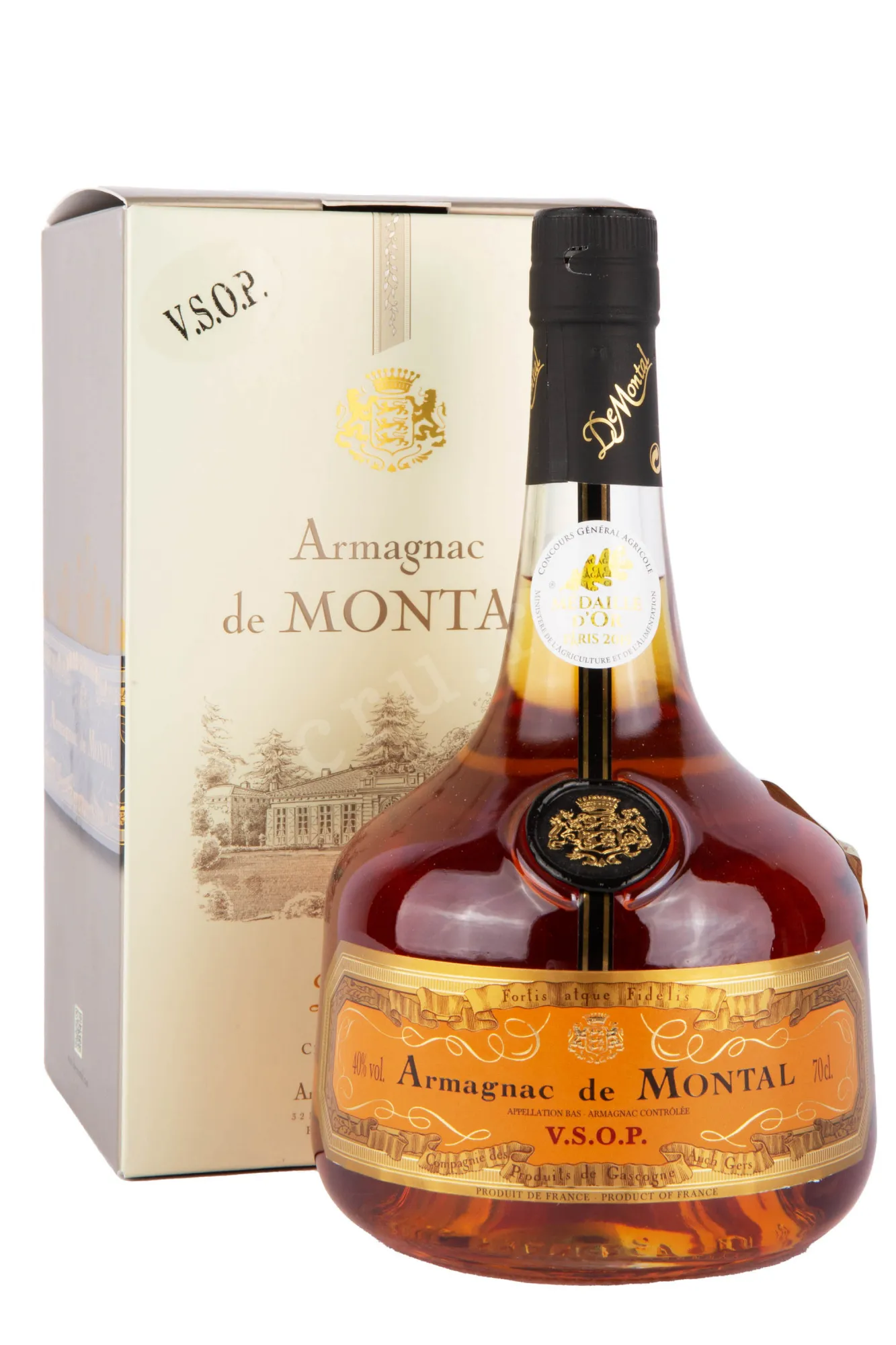 Арманьяк De Montal VSOP 0,7 л в подарочной упаковке — сувенирный релиз крепкого спиртного с защищенным наименованием. Основу напитка составляет классический купаж из нескольких сортов винограда, выращенных в терруаре с глинисто-известковыми почвами и умеренным климатом с влиянием Атлантики. Виноградники здесь получают достаточное количество влаги и хорошее солнечное освещение, что благоприятствует созреванию ягод с оптимальным балансом сахаров и кислот. Однократная дистилляция в медных аламбиках сохраняет тонкие ароматы и чистый вкус спиртов, а выдержка во французском дубена протяжении как минимум четырех лет придает бархатистую текстуру и щедрый букет.