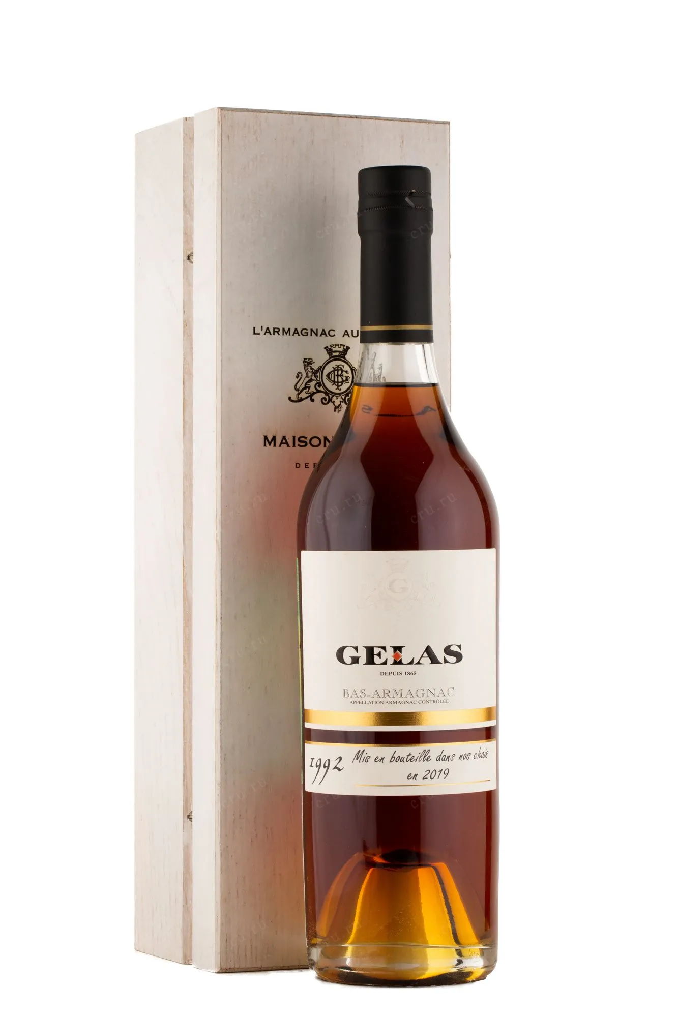 Арманьяк Gelas 1992 0,7 л — миллезимный напиток из региона Ба-Арманьяк, произведённый компанией Мезон Желас, которая была основана в середине XIX века. Урожай винограда в 1992 году отличался высоким качеством, чему способствовали благоприятные погодные условия. Исходный дистиллят был получен классическим способом с применением медных кубов. Затем он выдерживался в дубовых бочках около 30 лет. Емкости, изготовленные из особого сорта дуба с темной древесиной, произрастающего в лесах Гаскони, придали спиртам особые дегустационные свойства. Винтажный арманьяк был высоко оценен экспертами и получил коллекционный статус. Его стоит выбрать на роль оригинального подарка, а также можно приобрести для личного собрания редкого алкоголя, ведь через пару десятков лет он станет настоящим раритетом.