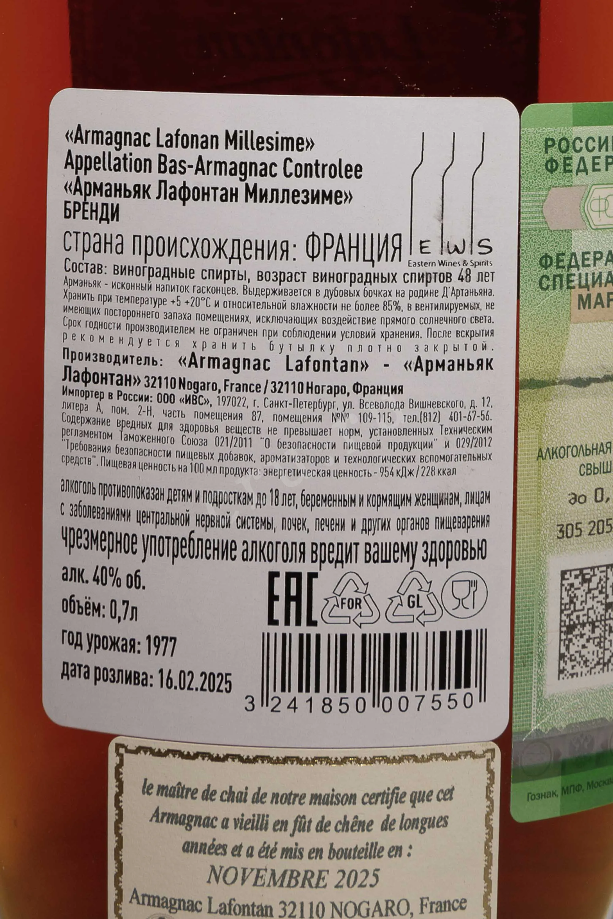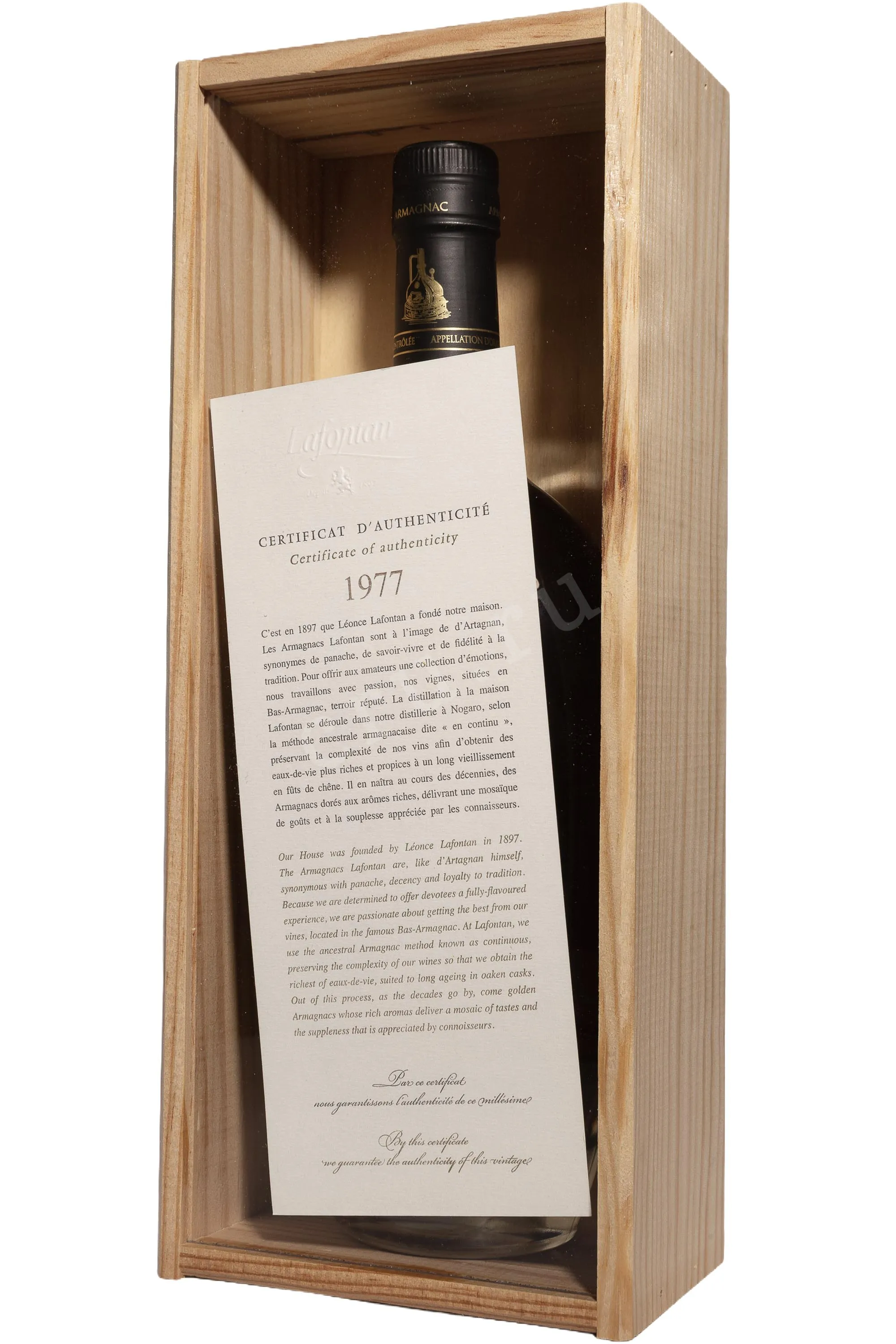 Арманьяк Lafontan в деревянной коробке 1977 год 0.7 л — классический, со строгой спокойной стилистикой, ориентированной на ценителей зрелых миллезимов. Произведён из одного урожая, без купажирования, что подчёркивает индивидуальность характера. Перегонка проводилась традиционным способом в медном аламбике непрерывного действия, после чего спирты созревали в дубовых бочках не менее 48 лет. За десятилетия выдержки арманьяк приобрел мягкую структуру и глубокий ароматический профиль. Дом Лафонтан известен бережным подходом к старым миллезимам и сохранением их естественного баланса. Выпуск в деревянной коробке подчёркивает статус и коллекционную ценность релиза.