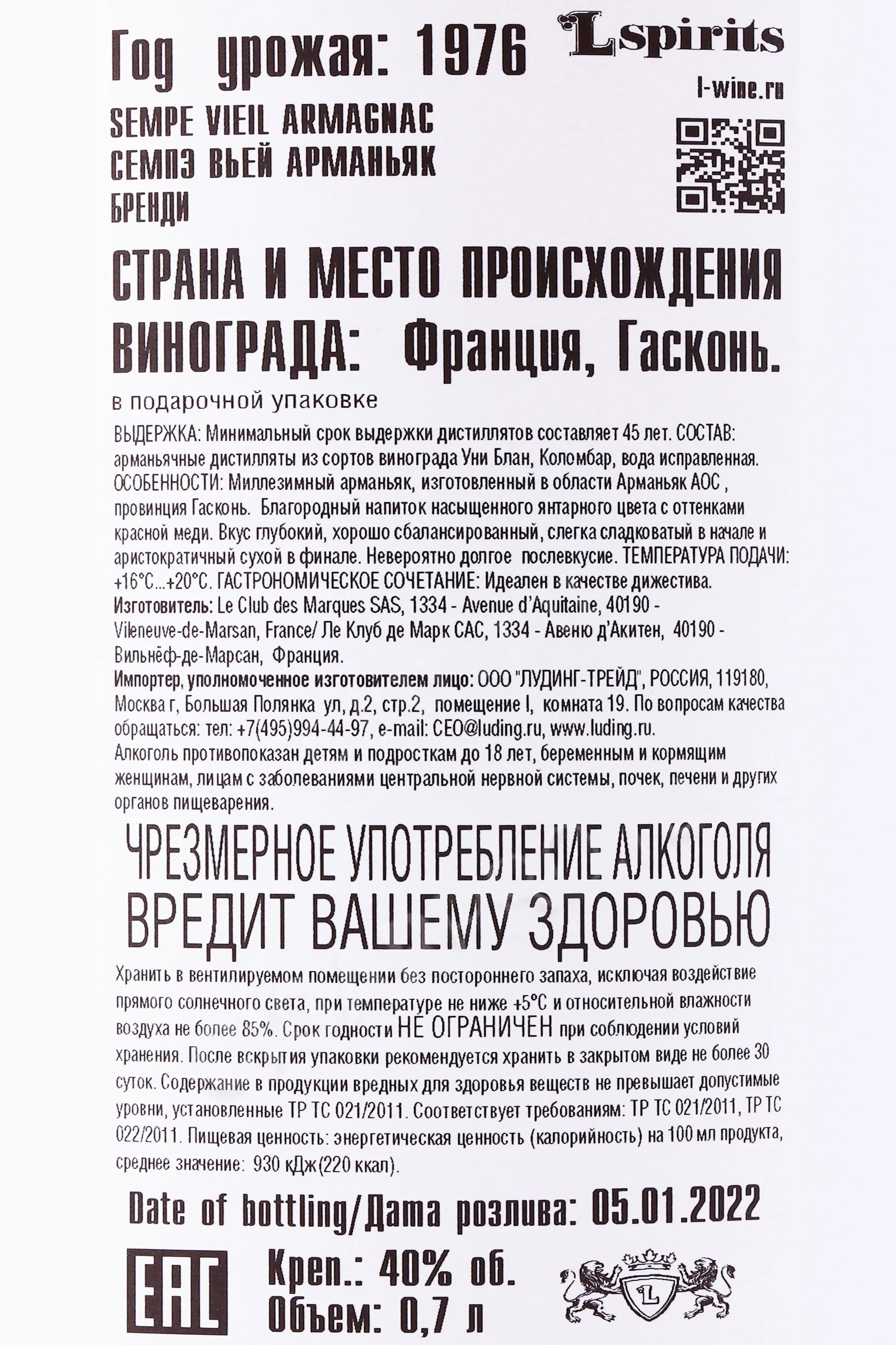 Арманьяк Sempe 1976 0,7 л создан из урожая очень засушливого года и отличается уникальной стилистикой. С мая по август выпало в разы меньше осадков, чем обычно, а с 15.08 до 15.09 их не было вообще. Из-за этого виноград был мелким, но с высокой концентрацией вкусовых и ароматических веществ. Объем урожая естественным образом уменьшился, чем объясняется ограниченный тираж винтажа 1975 года. Дистилляция проводилась традиционным методом с использованием аламбиков, после чего арманьяк более 40 лет выдерживался в дубовых бочках, приобретая глубокий аромат и вкус. Крепость напитка составляет 40%. Этот винтаж ценится коллекционерами и знатоками за сбалансированность и насыщенность.