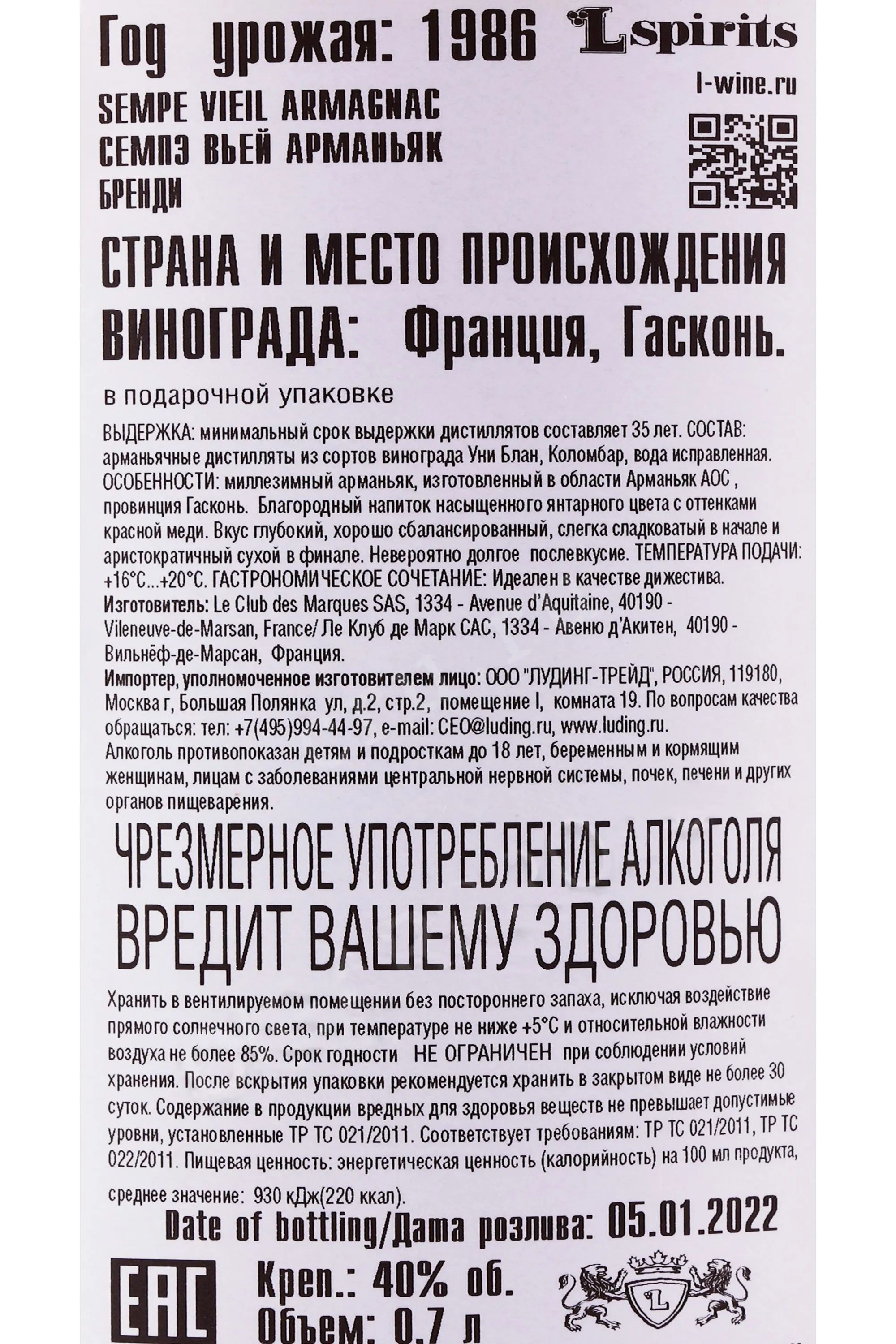Арманьяк Sempe 1986 0,7 л — элегантный винтажный напиток, изготовленный из урожая винограда, собранного в 1986 году. Сезон был отмечен жарким и сухим летом. Благодаря традиционной однократной перегонке в медных аламбиках арманьяк сохраняет глубокий характер исходного сырья. Он выдерживался более 30 лет в бочках из гасконского дуба, что придало ему насыщенный вкус и великолепную текстуру. Особенностью является строгий отбор бочек мастером погреба, что обеспечивает высокое качество каждой партии. Винтаж Семпе 1986 года удостоен высокой оценки на престижных международных конкурсах и является ценным коллекционным образцом.
