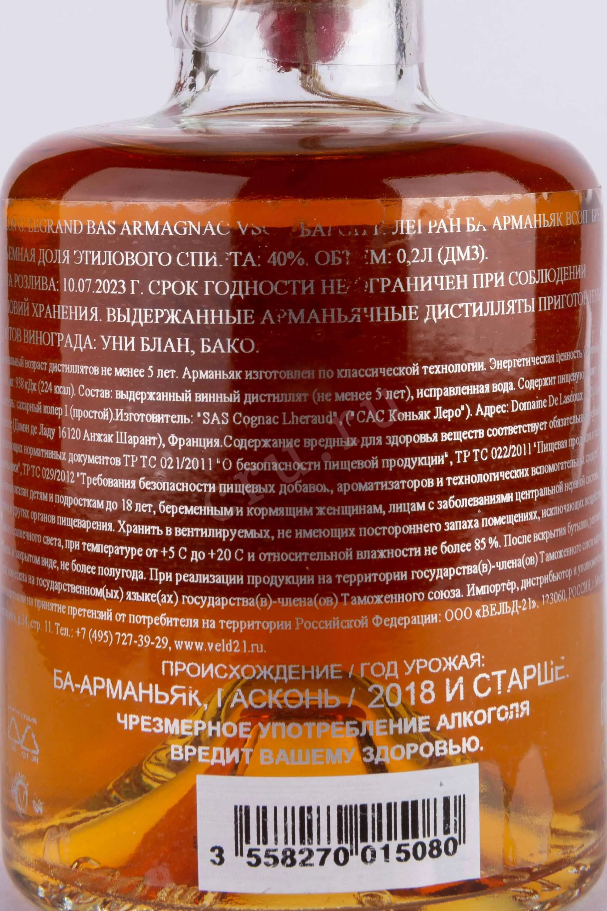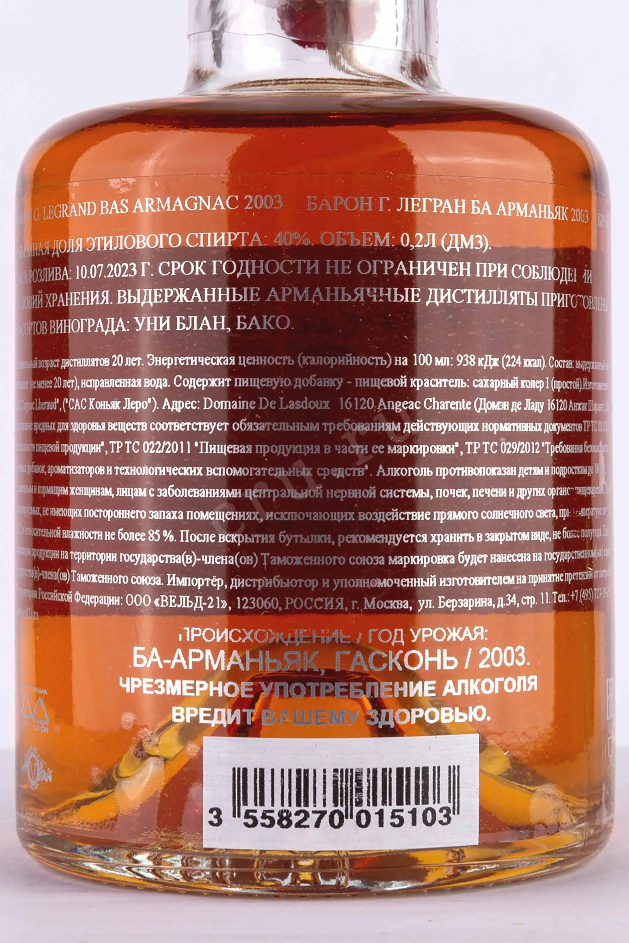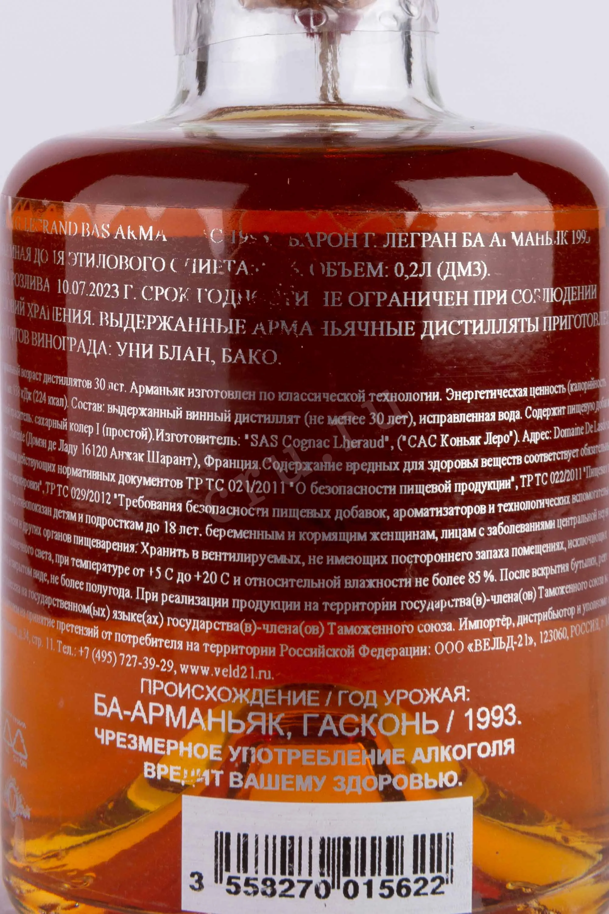 Эти арманьяки создаются по классическим технологиями из сортов Уни Блан и Бако (с престижных виноградников Ба-Арманьяка), выдерживаются длительное время во французским дубе и демонстрируют индивидуальный, узнаваемый стиль дома Барон Г. Легран. Они представлены в миниатюрных бутылочках, напоминающих аптечные флаконы с корковыми пробками и и сургучной печатью, по 200 мл, что очень удобно для ознакомительной и персональной дегустации.