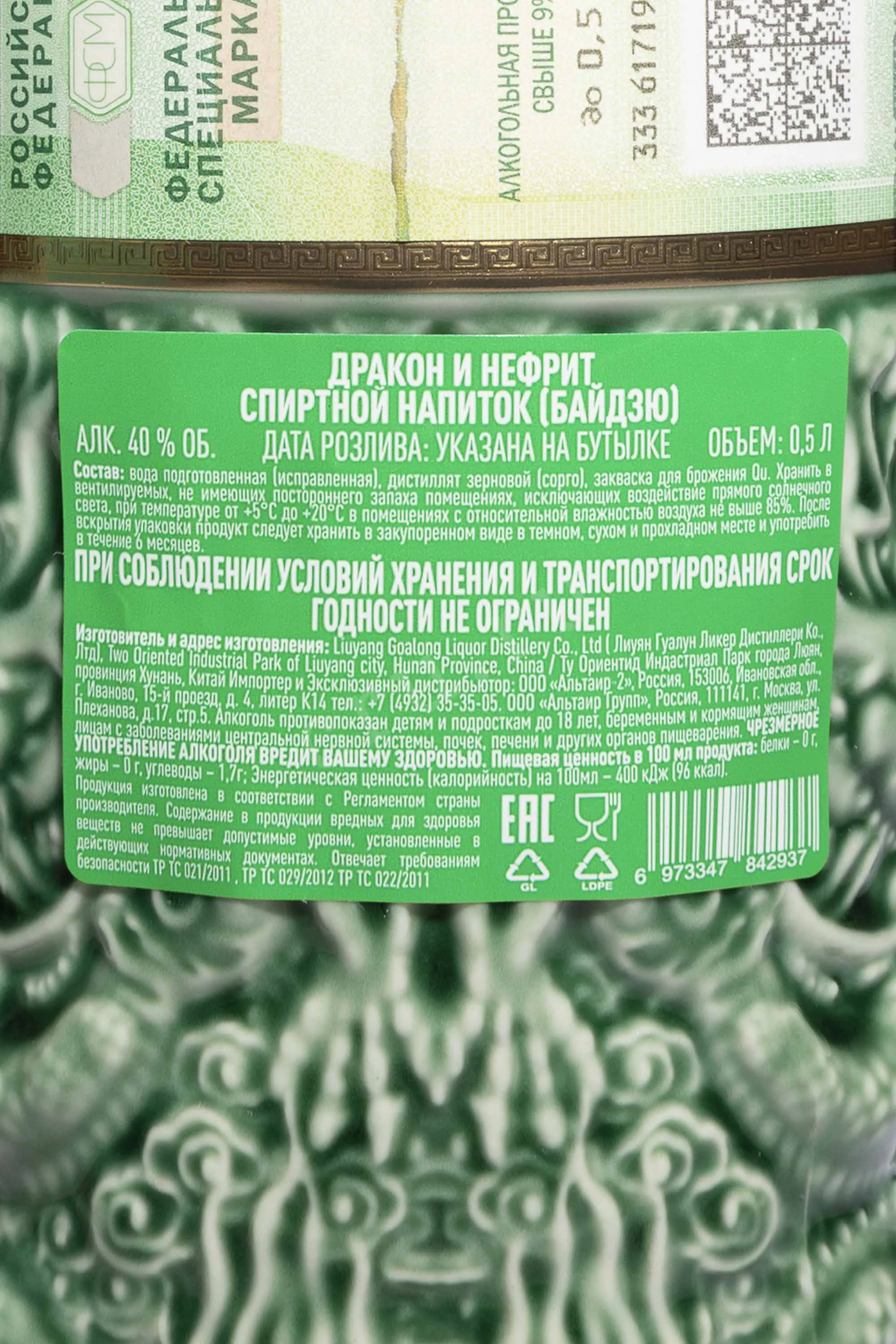 Байцзю Goalong Dragon & Jade 0,5 л в подарочной упаковке представляет собой крепкий напиток, созданный по традиции китайского перегонного искусства. Релиз выпущен хозяйством из провинции Хунань, где мягкая родниковая вода и влажный субтропический климат формируют узнаваемый стиль местного спиртного. Основой образца служит сорго, прошедшее многоступенчатое брожение с использованием закваски «цюй». Ферментированное сусло затем перегоняют в небольших аппаратах, выдерживают в глиняных емкостях и собирают партии по качеству и аромату. Такой метод дает плотный характер, выразительную структуру и строгое соответствие региональной традиции. Серия Dragon & Jade выделяется тщательной сортировкой сырья, плавной текстурой и яркой идентичностью, которую подчеркивает подарочная упаковка.