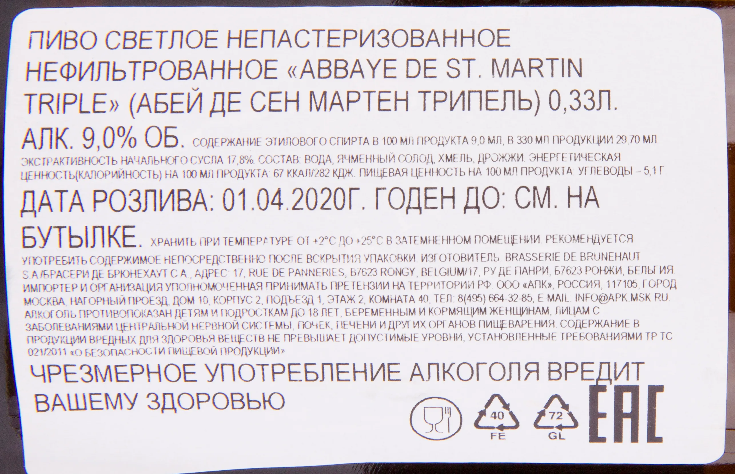 Abbaye de St. Martin Tripel 0.33 л купить - Бельгийское пиво Абей де Сен Мартен Трипль цена в магазине