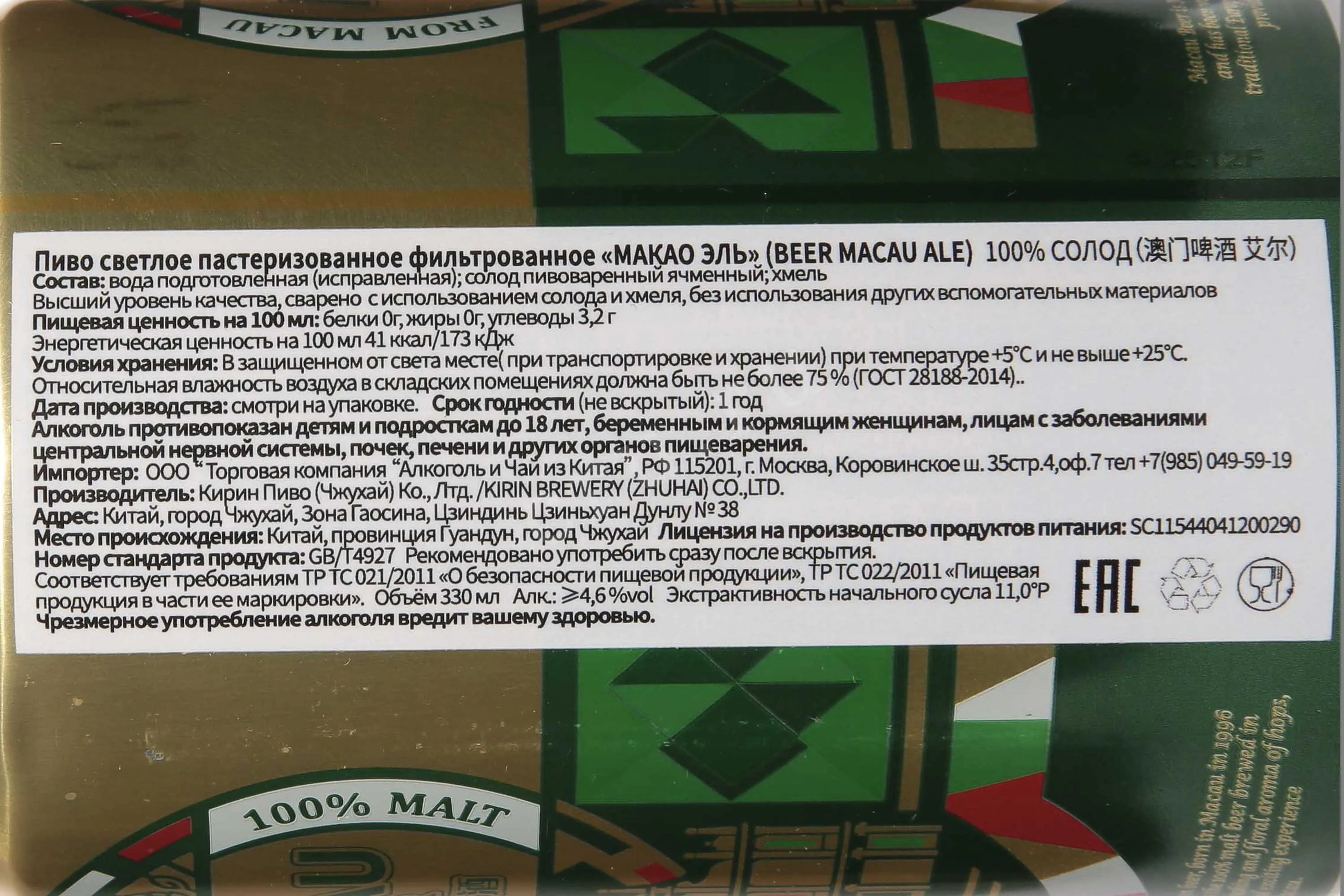 Пиво Macau Beer Ale 0,33 л в металлической банке — это крафтовый эль, выпускаемый в Макао, одном из центров пивоваренных традиций Южного Китая. Напиток отличается питкостью и сбалансированным вкусом с акцентом на солодовую основу. Для производства используются тщательно отобранный ячмень и хмель, обеспечивающие характерный аромат и свежий вкус. Технология верхового брожения придает мягкость и сложный ароматический буке. В процессе варки применяются современные методы контроля температуры и ферментации, благодаря чему достигается стабильное качество. Формат жестяной банки удобен для хранения и транспортировки, хорошо сохраняет свежесть и пузырьки в содержимом.