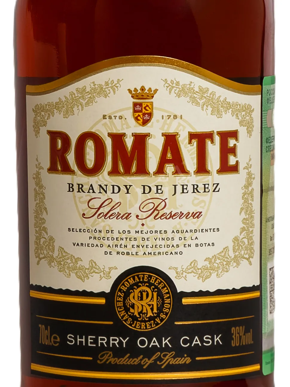 Бренди де Херес Romate Solera Reserva 2022 года 0.7 л — испанский выдержанный виноградный дистиллят из региона Херес. Создаётся по традиционному методу солера. Основой служат спирты из белого винограда Айрен. Выдержка (не менее 3 лет) проходит в бочках из американского дуба, ранее использованных для хереса, что формирует характерный профиль. Система солера обеспечивает постепенное смешивание разновозрастных дистиллятов и достижение стабильного вкуса. Дом Ромате известен с XIX века и входит в число старейших производителей региона. Его хересный бренди регулярно получает высокие оценки на международных конкурсах, отмечается за мягкость и сбалансированность.