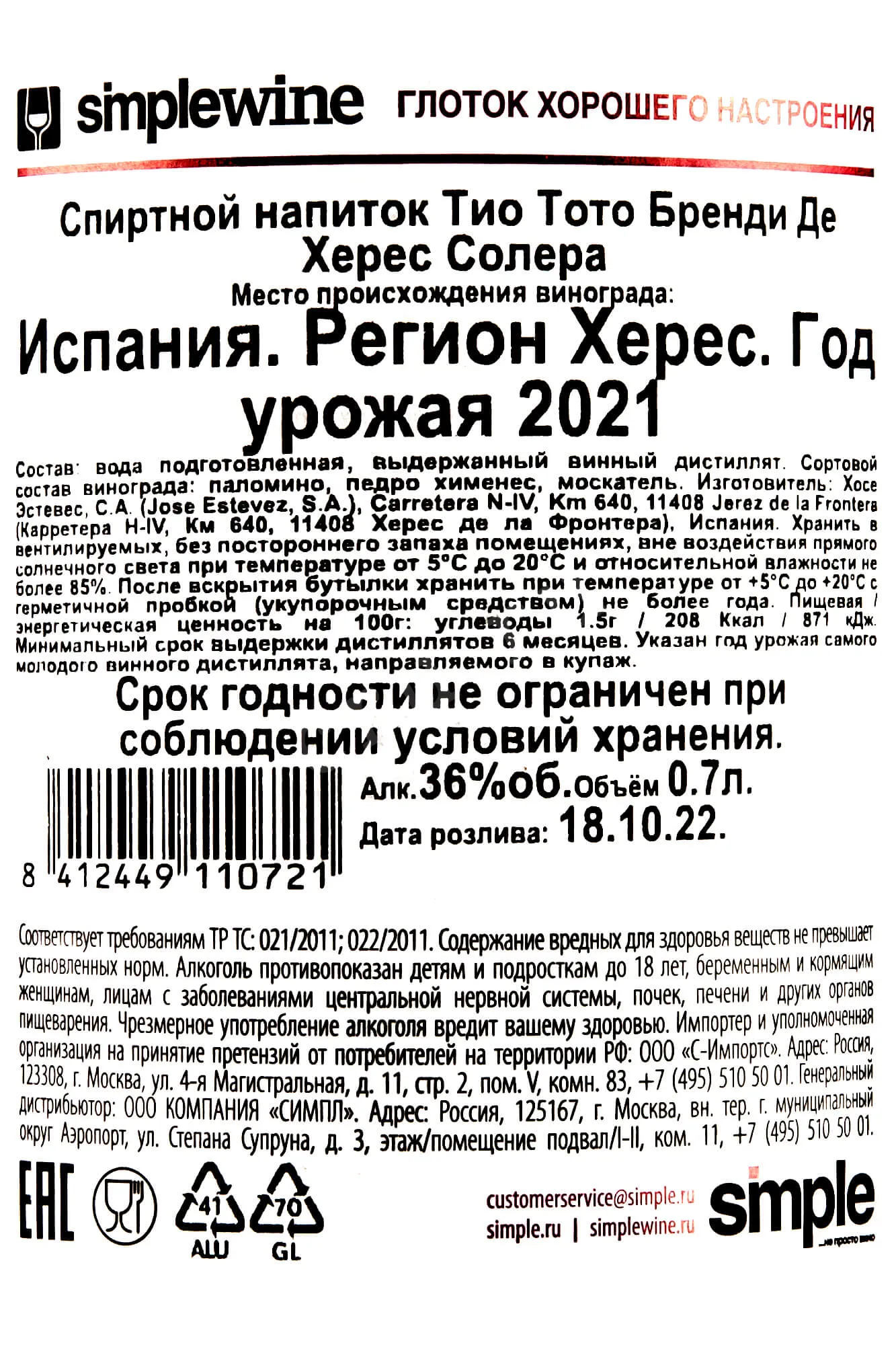 Бренди Tio Toto Solera 2021 0.7 l – это высококачественный испанский алкоголь, выпускаемый в Андалусии. Основой этого напитка является виноград трех сортов урожая 2021 года. После обработки ягоды подвергаются ферментации с последующей перегонкой в медных кубах. Созревали спирты по системе солера в дубовых барриках в течение одного года. Розлив готового бренди был осуществлен в октябре 2022 года при крепости 36%. Выпускается спиртное в элегантных сосудах из прозрачного стекла объемом 700 мл.