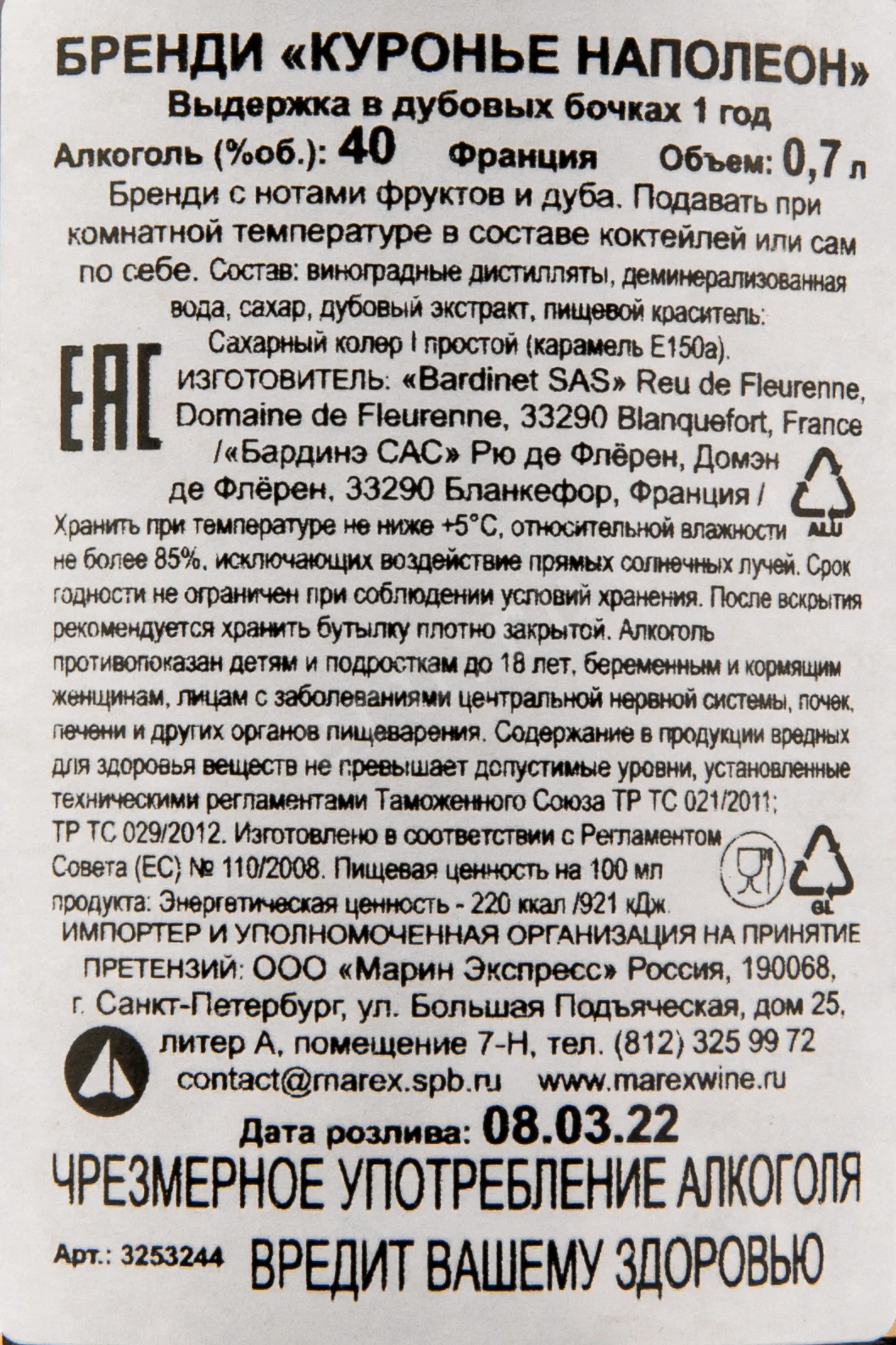 Бренди Bardinet Couronnier Napoleon 0.7 l – это выдержанный французский алкоголь, выпуском которого занимается одноименная компания с более чем полуторавековой историей. Основой крепкого напитка является виноград двух сортов, который выращивается на местных плантациях. После обработки сырье подвергается ферментации при контролируемой температуре. Затем сусло дважды перегоняется в медных аппаратах. Выдерживаются спирты в бочках из французского дуба в течение минимум трех лет. Готовый бренди разливается при крепости 40% в классические сосуды из затемненного стекла.