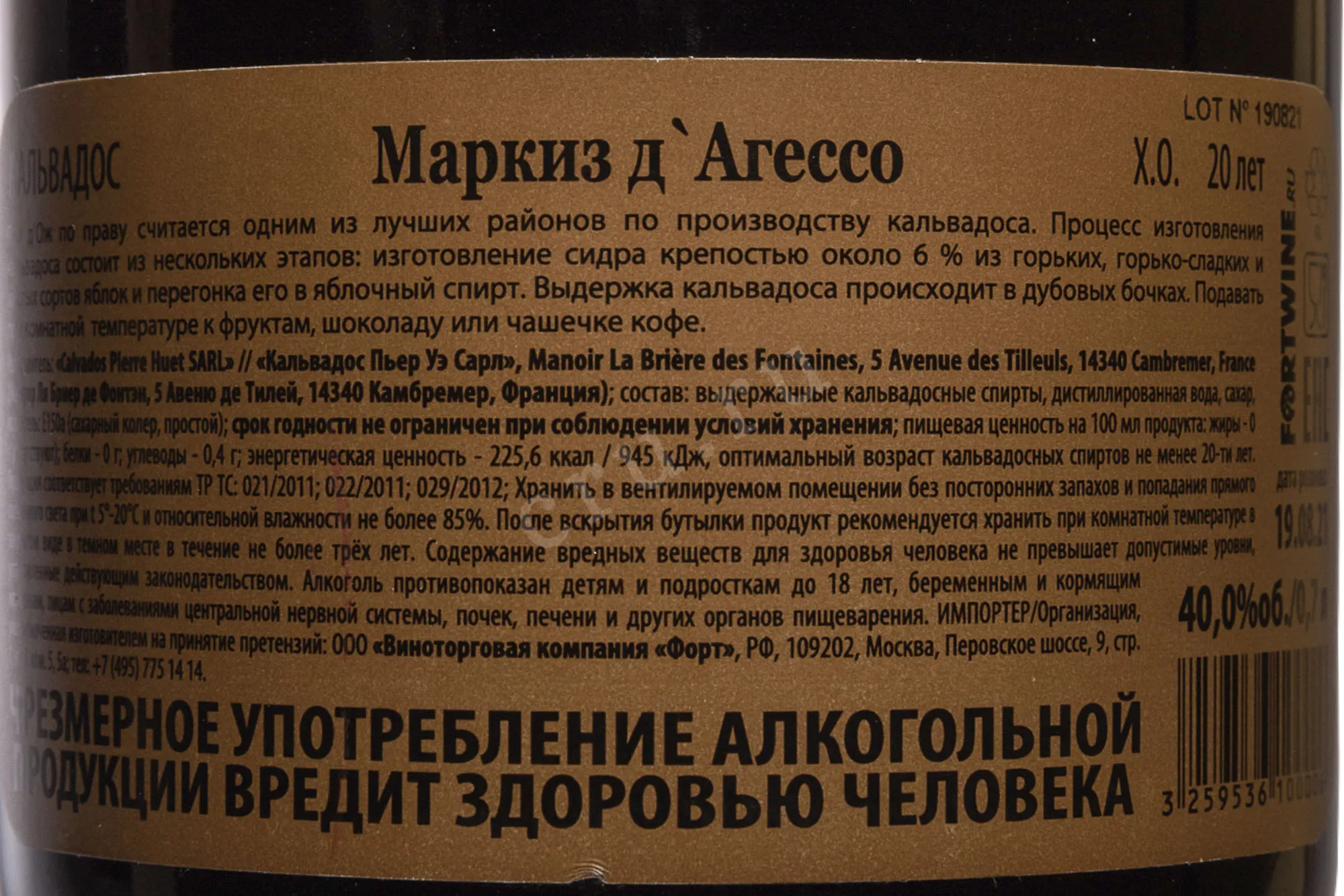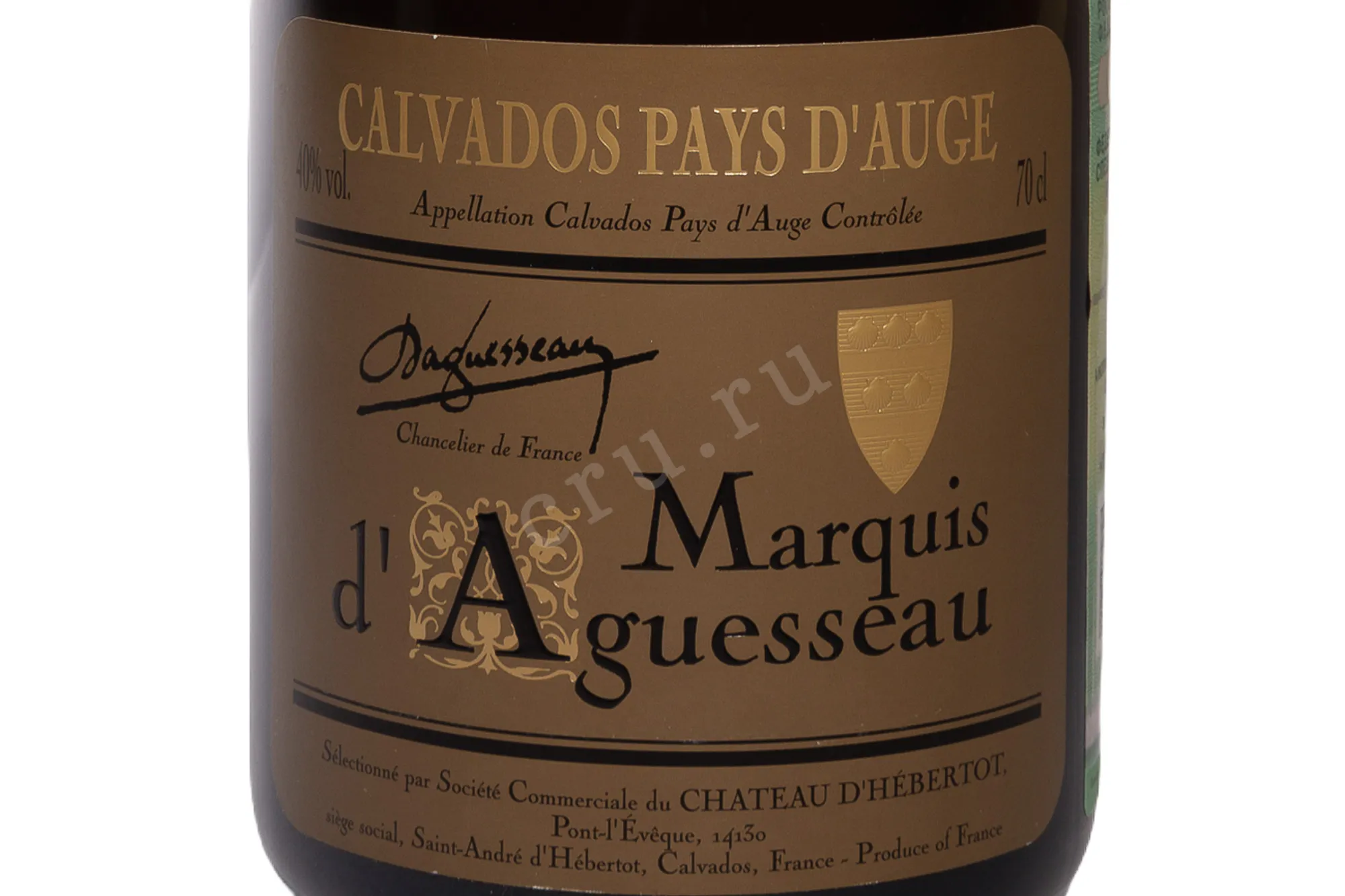 Кальвадос Marquis d`Aguesseau XO 20 лет 0,7 л в подарочной упаковке — выдержанный яблочный бренди из региона Пэи д`Ож в Нормандии. Он производится по традиционной технологии из сидра, который получают из местных яблок, выращенных на глинисто-известковых почвах. Спирты изготавливают методом двойной перегонных в медных аламбиках, а затем — выдерживают на протяжении двух десятилетий в дубовых бочках, где дистилляты приобретают элегантный и выразительный характер.
