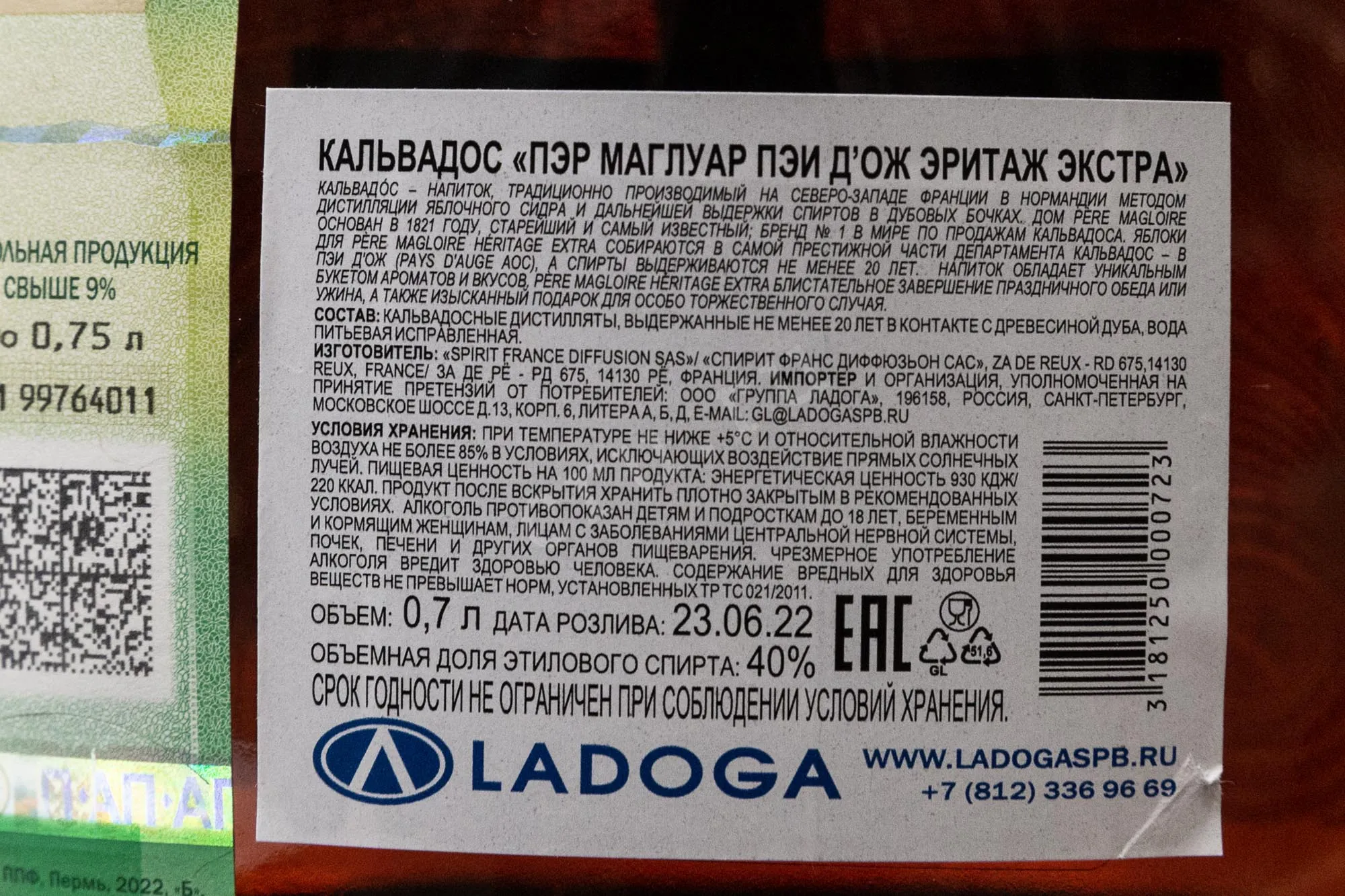 Кальвадос Pere Magloire Heritage Extra 0.7 л был создан в самом сердце французской Нормандии, на территории региона Пеи-д`Ож. Для производства использовали отборные яблоки местных сортов, выросшие на глинисто-известковых почвах, богатых минералами и полезными микроэлементами. Урожай собирали вручную, после чего фруктовый сок подвергали двойной перегонке в традиционных медных кубах-шарантах. Дистилляты выдерживались в дубовых бочках, тщательно подобранных для раскрытия их аромата и вкуса. Уникальность напитку придал длительный срок созревания в старинных погребах, где соблюдался оптимальный температурный режим и влажность воздуха.