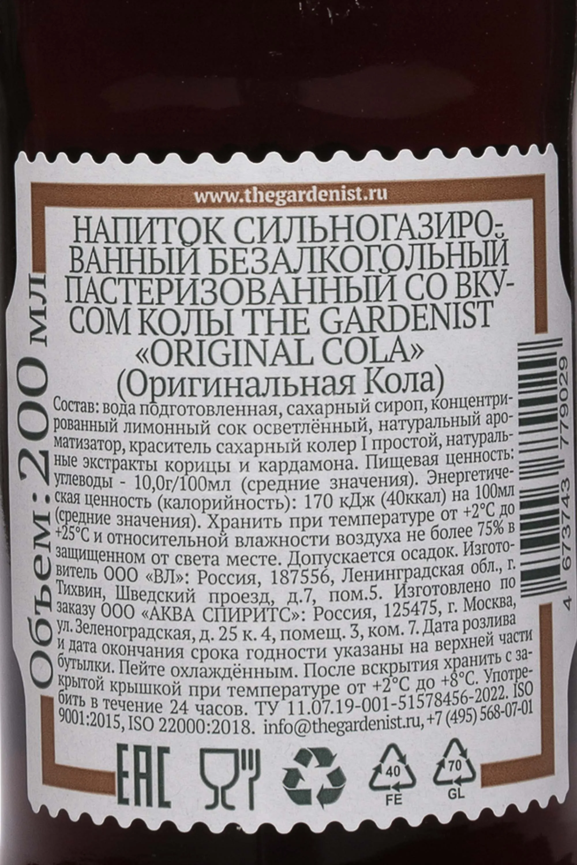 Газированный напиток The Gardenist Original Cola 0.2 л — это натуральная кола без кофеина и консервантов, созданная в классическом стиле, но с современным подходом к рецептуре. Производится с использованием натуральных ингредиентов и чистой воды, что подчеркивает мягкость и глубину вкуса. Напиток не содержит искусственных добавок, благодаря чему сохраняет сбалансированный аромат и легкую сладость. В его составе сочетаются традиционные ноты колы с легкими пряными оттенками, нюансами шоколада и кофе. Такая комбинация делает букет выразительным и гармоничным. The Gardenist Original Cola — выбор тех, кто ценит натуральность и оригинальный вкус.