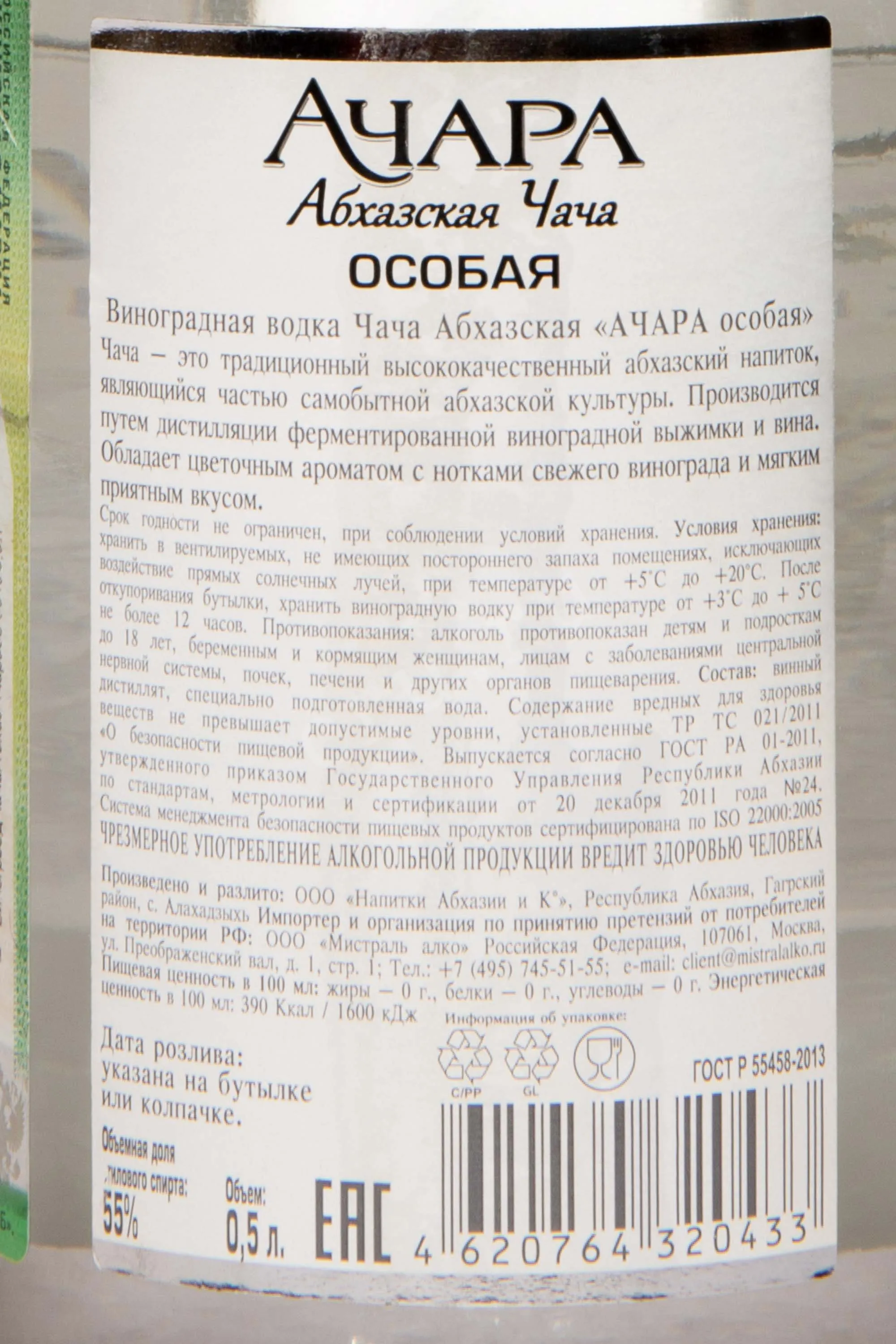Чача Achara Special 0.5 л — крепкий дистиллят, созданный по традиционной кавказской технологии из отборного виноградного сырья. Для производства используют выжимки и сок местных сортов, выращенных в мягком субтропическом климате Абхазии. Терруар региона формируется сочетанием тёплого морского воздуха, горных склонов и известково-глинистых почв, что придаёт ягодам высокую сахаристость и насыщенный ароматический профиль. Сброженное сусло перегоняют в медных аламбиках, что позволяет сохранить характерную фруктовую выразительность и добиться чистоты спирта. Повышенная крепость 55% подчёркивает аутентичный стиль напитка и его согревающий темперамент, сохраняя при этом мягкость благодаря тщательной фракционной перегонке.