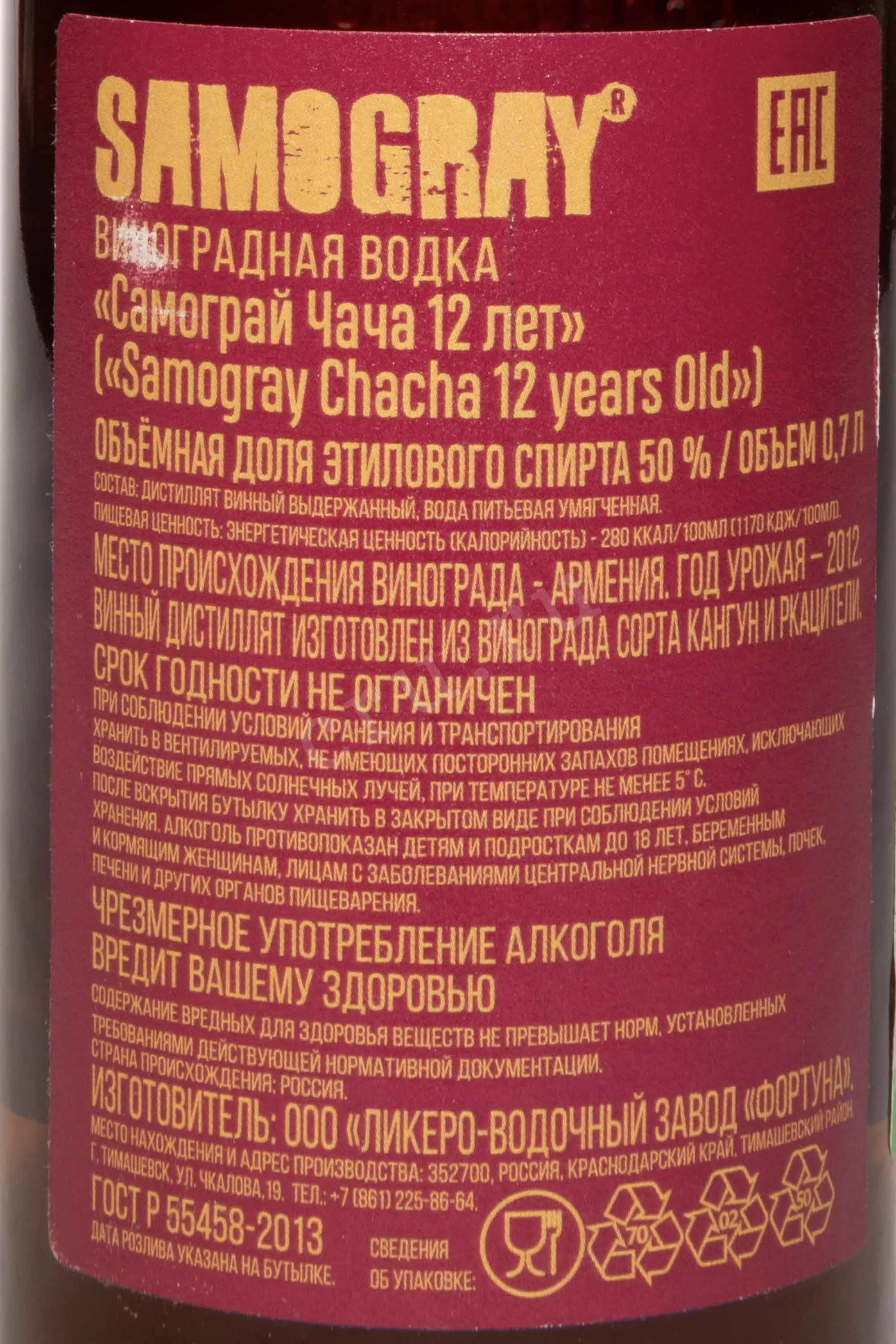 Чача Samogray Chacha 12 лет 0,7 л в тубе – выдержанный дистиллят, созданный по традиционной технологии. Основой служит виноградный жмых, полученный после прессования ягод, выращенных на солнечных склонах. Перегонка проводится медленно, в медных аламбиках, что позволяет сохранить яркий вкус и убрать лишнюю резкость. После напиток выдерживается во французских дубовых бочках не менее 12 лет, приобретая мягкость и многослойный характер. Длительное хранение в контакте с древесиной придает купажу золотисто-янтарный цвет и сложный букет.