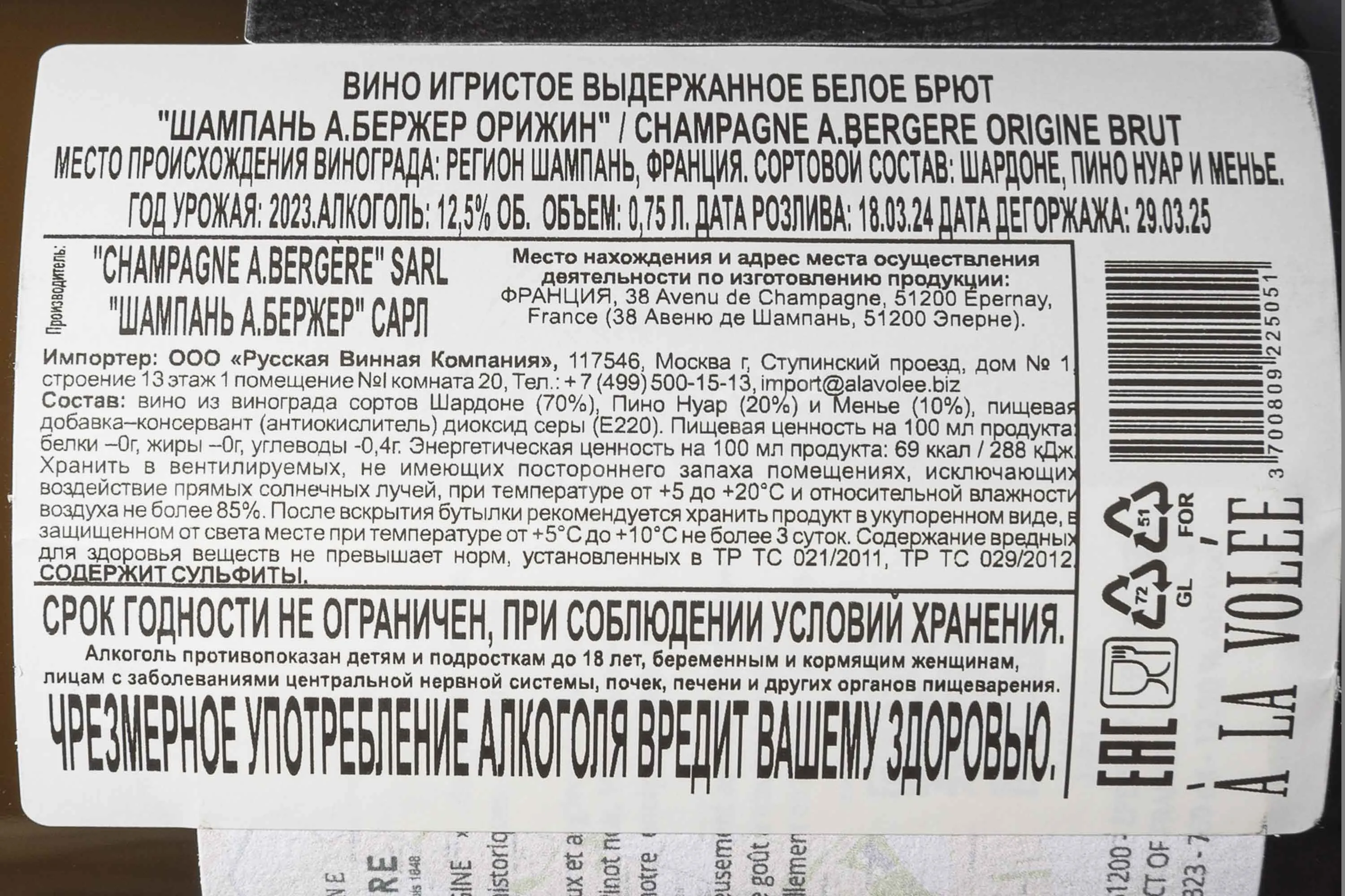 Шампанское A. Bergere Origine Brut в подарочной упаковке 2023 года 0,75 л отражает сдержанную и точную стилистику дома В. Бержере, ориентированную на чистоту терруара и баланс. Виноград выращен в коммунах Феребрианж, Этож и Конжи, расположенных в зоне Валле-дю-Пти-Морен. Здесь сочетаются вторичные меловые почвы и третичные песчано-глинистые слои, что формирует свежий и ясный профиль вин. В 2023 году погода в целом была ровной, а сезонные температуры умеренными, что позволило винограду сохранить кислотность и ароматическую выразительность. Базовая винификация велась как в стальных чанах, так и в дубовых бочках объёмом 228 литров. Для кюве было использовано около 30% резервных вин. Фильтрация не применялась. Выдержка на тонком осадке в бутылке длилась 12 месяцев. Кюве задумывалось Адрианом Бержером как отражение характера местных терруаров и получило высокие оценки профессиональных дегустаторов.