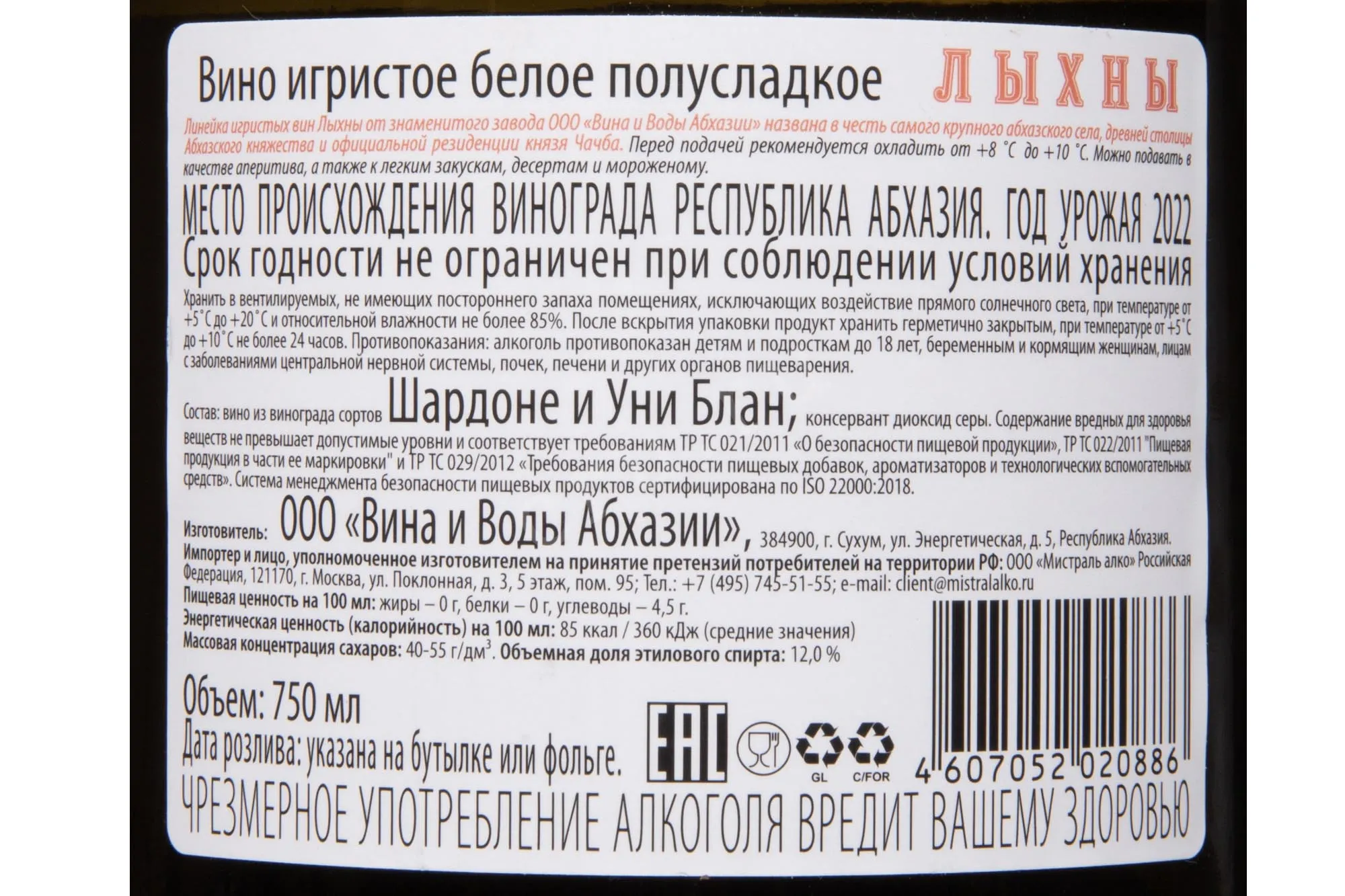 Lykhny White Semi-Sweet 2022 0.75 л купить - Абхазское игристое вино Лыхны Белое Полусладкое цена в магазине КРЮ ПРОФИ г. Москва, ул. Профсоюзная, д. 16/10 10:00-22:00 Ежедневно +7 (495) 920-20-02 info@cru.ru