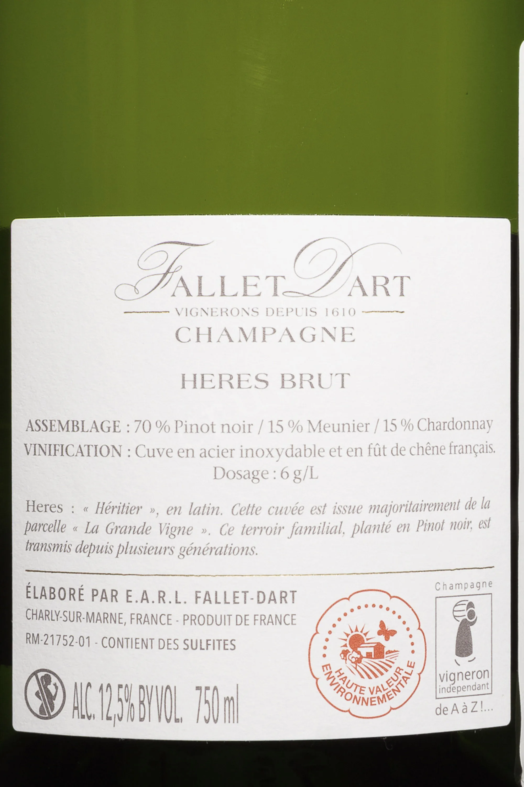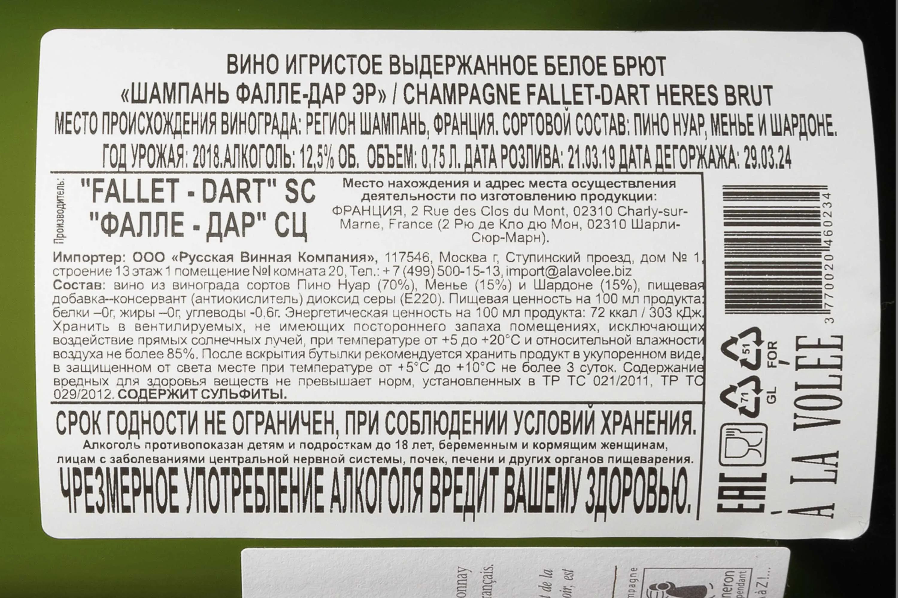 Шампанское белое брют Fallet Dart Heres 2018 г. 0,75 л создано на юге Шампани, где хозяйство Fallet Dart работает с виноградниками, расположенными на участках с высоким содержанием известняка. Винтаж отличился тёплой погодой и равномерным созреванием плодов, что позволило получить концентрированное сырьё без потери кислотности. Ягоды собрали вручную и мягко прессовали. Первичное брожение проходило в резервуарах, чтобы сохранить чистый характер сорта. Затем базовое вино разлили по бутылкам, где оно прошло вторичную ферментацию, а затем долго созревало на осадке, приобретая сложность и тонкую кремовость.