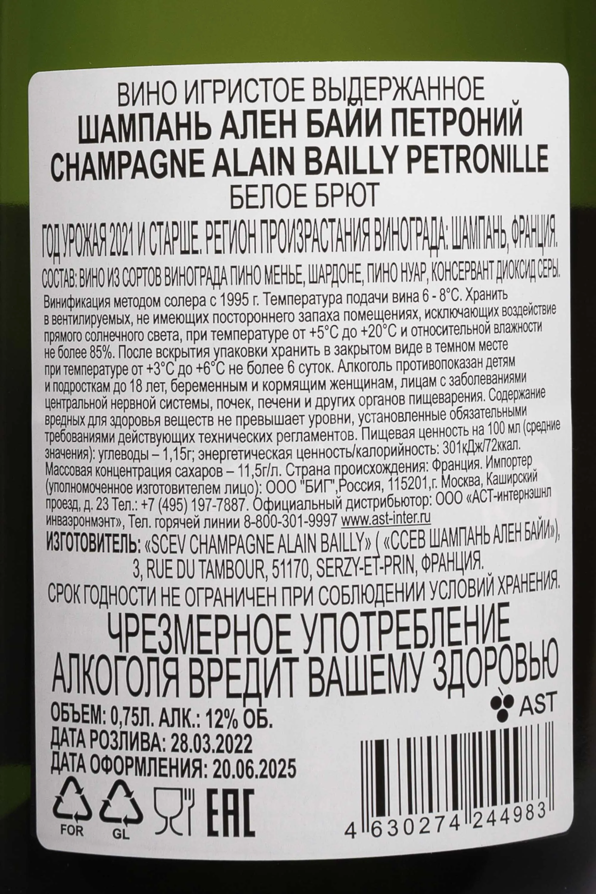 Шампанское Alain Bailly Cuvee Petronille в подарочной упаковке 2021 года 0.75 л — выдержанный брют с классической стилистикой региона Шампань. Отличается сдержанной элегантностью и точным балансом. Виноград для производства выращивался в нескольких терурарах долины Марны: сорт Пино Менье происходит из Serzy, где преобладают песчаные почвы, Пино Нуар — из зоны Sacy Mi-Cote (почвы из известняка и туфа, глинистые и песчаные), Шардоне — из Sacy Haut (доминируют известняк и мергель). Урожай 2021 года формировался в условиях переменчивой погоды. Год был непростым, но дал кюве с высокой кислотностью и хорошим потенциалом выдержки. Виноградники обрабатываются без минеральных удобрений, с бережным отношением к экосистеме. Сбор проводится вручную при оптимальной зрелости ягод. Алкогольная и яблочно-молочная ферментации проходят в стальных чанах при 18 °C. Небольшая часть резервного вина выдерживается в дубе. После Вторичной ферментации в бутылках выдержка длится не менее трёх лет. Дегоржаж проводится за несколько месяцев до выпуска, дозаж не превышает 9 граммов на литр.