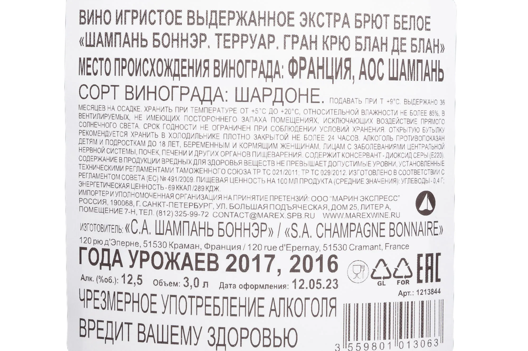 Шампанское белое экстра-брют Bonnaire Terroirs Grand Cru Blanc De Blancs 3 л в деревянноой коробке — это выдержанный релиз из коммуны Краман, одной из немногих деревень Шампани со статусом Grand Cru. Дом Боннэр — семейное хозяйство, работающее с собственными виноградниками, что позволяет строго контролировать происхождение и качество сырья. Кюве под названием Терруар отражает идею мозаики участков: оно создаётся из ягод Шардоне, собранных в разных участках местности, где меловые почвы формируют минеральный профиль и высокую кислотность. Производство ведётся классическим шампанским методом с вторичной ферментацией в бутылке. Стиль минимально корректируется дозажом и подчёркивает природную структуру вина. Солидный формат обеспечивает медленное развитие и стабильность вкуса при длительной выдержке, а также превращает образец в презентабельный сувенир.