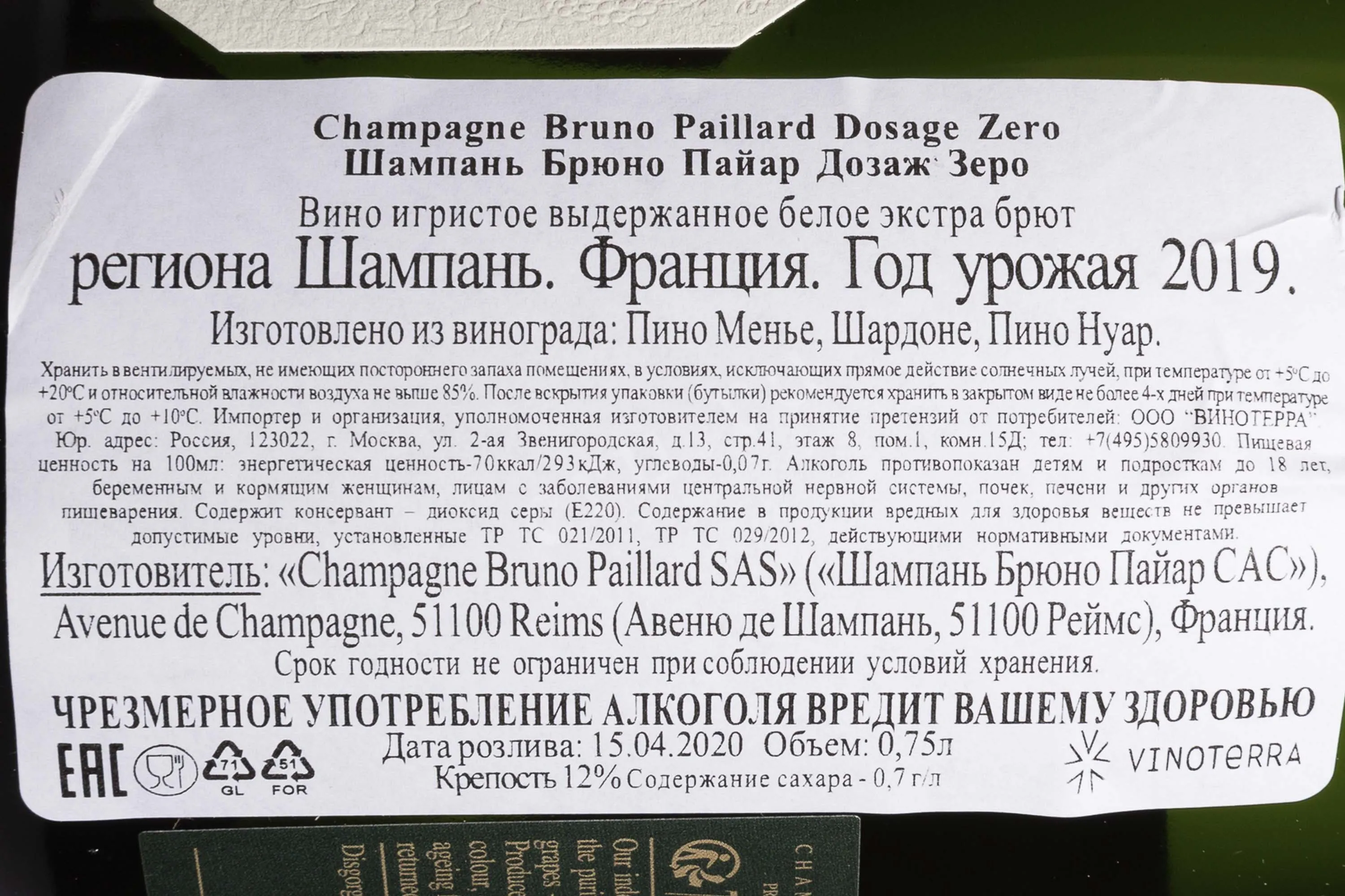 Шампанское белое брют-натюр Bruno Paillard Dosage Zero 2019 г. 0,75 л в подарочной упаковке создано как образец фирменного стиля, ориентированного на чистоту, энергию и точность. Напиток выделяется авторским подходом к созданию базовых вин: для этого используется урожай с более чем тридцати разных крю из ключевых зон Шампани, а основой служит сусло только первого отжима. Важную роль играет система «vin de réserve» — около половины купажа составляют выдержанные вина, часть из которых проходит цикл, напоминающий испанскую солеру. Завершающее созревание на осадке в бутылках после вторичного брожения продолжалось несколько лет, а отказ от дозажа сделал образец предельно сухим, создав акцент на виноград, терруар и глубокий характер выдержки.