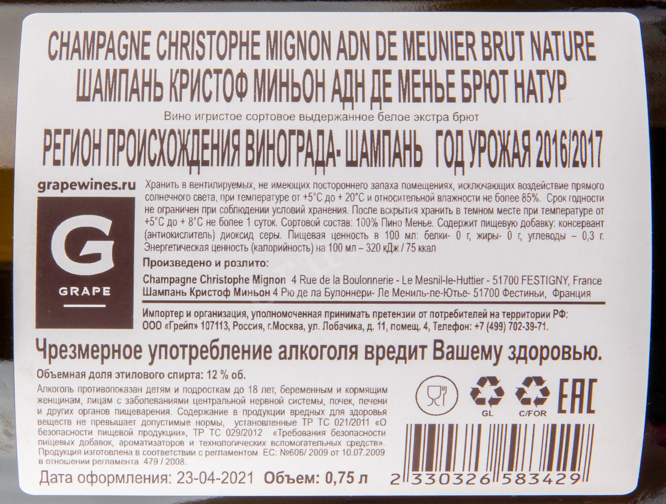 Шампанское Christophe Mignon ADN de Meunier Brut Nature 0.75 l – это элегантный французский моносортовой алкоголь, созданный из урожая 2016-17 гг. Ягоды были собраны вручную с лоз в долине Мароны, средний возраст которых составляет 46 лет. Виноград отправляют под пневматический пресс, а полученный сок сбраживают в стальных резервуарах и эмалированных чанах. Напиток выдерживается на осадке от 5 до 18 месяцев, а после еще 3 года в бутылках. Дегоржаж был произведен в апреле 2021 года. 12-процентное белое шампанское категории экстра брют не содержит сахара и имеет потенциал хранения более 5 лет.