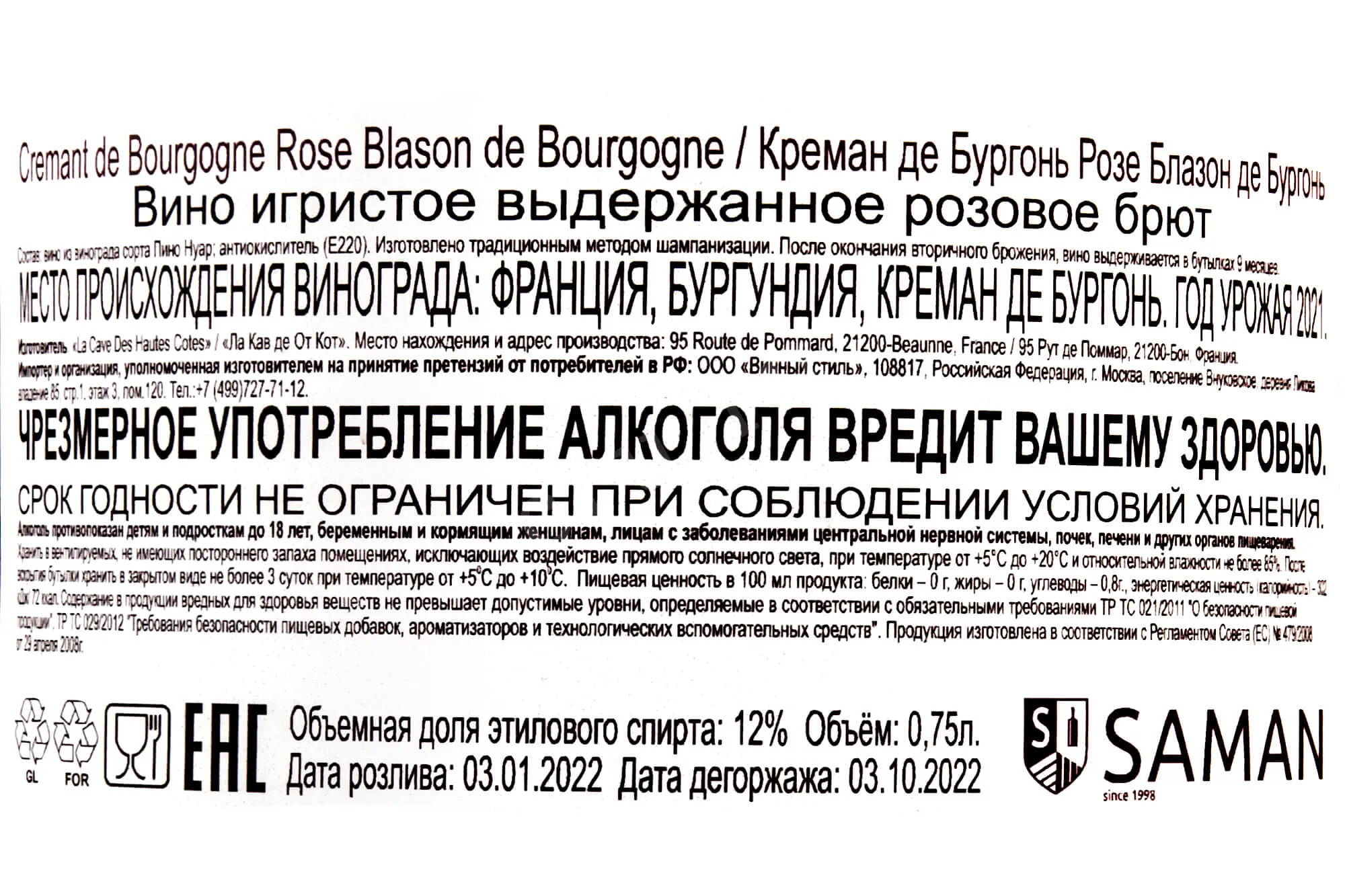 Blason de Bourgogne Rose 2021 0.75 л купить — Игристое вино Бласон де Бургонь Розе в магазине КРЮ ПРОФИ г. Москва, ул. Профсоюзная, д. 16/10 10:00-22:00 Ежедневно +7 (495) 920-20-02 info@cru.ru