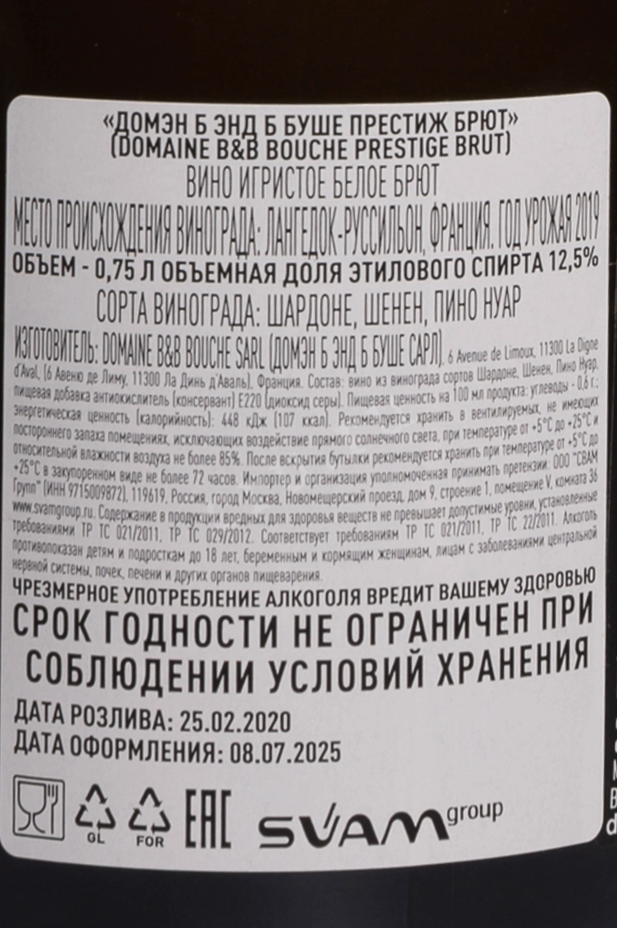 Игристое вино Domaine B&B Bouche Cremant Prestige Brut 2019 года 0,75 л относится к классическому стилю креманов юга Франции. Он сдержанный, сухой, с выраженной свежестью и тонкой гастрономичностью. Виноград был выращен в апелласьоне Лиму в регионе Лангедок-Руссильон, на виноградниках, расположенных примерно на высоте 500 метров над уровнем моря. Такое местоположение обеспечивает прохладные ночи и медленное созревание ягод, что сохраняет кислотность и ароматическую чистоту. 2019 год считается благоприятным для виноделов региона. Лето было теплым и стабильным, без экстремальной жары, а сбор прошёл в оптимальные сроки. Вино произведено традиционным методом с вторичной ферментацией в бутылке. После брожения оно выдерживалось на осадке около 60 месяцев, что редкость для кремана и придаёт вкусу глубину и сложность. Домэн Б энд Б Буше Престиж Брют выпускается в ограниченном объёме и ценится за длительную выдержку и точный баланс, что выделяет его среди других креманов апелласьона.