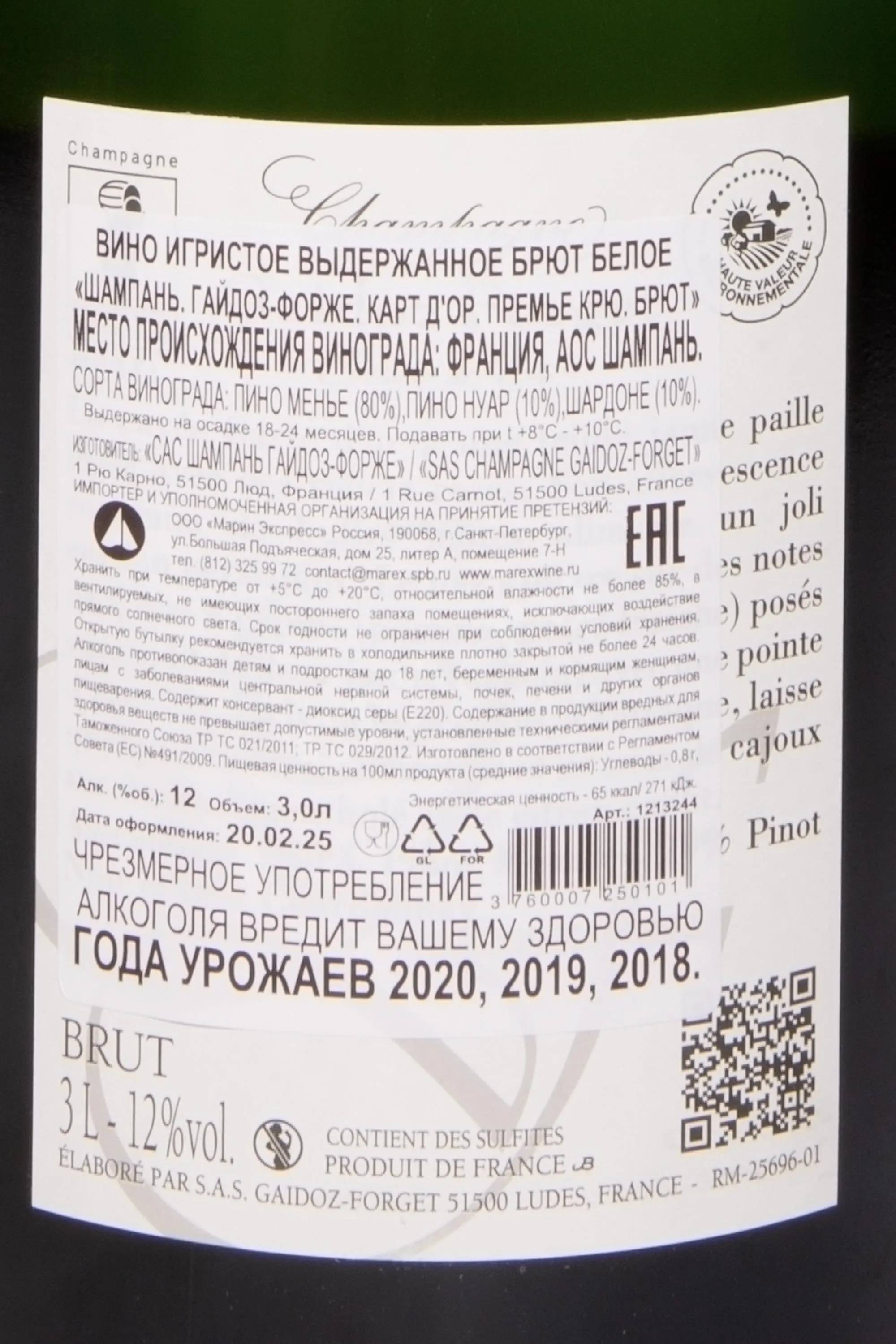 Шампанское Gaidoz Forget Carte d'Or Premier Cru AOC in wooden box 2020 3 л было создано из урожая, собранного вручную на уникальных виноградниках Шампани, классифицированных как Premier Cru. Урожай 2020 года отличался исключительными климатическими условиями, благодаря чему ягоды приобрели идеальный баланс кислотности и сахаров. Производство осуществлялось традиционным методом шампенуа с выдержкой на осадке не менее 18 месяцев в старинных погребах дома Gaidoz Forget. Особенностью технологии стал деликатный ремюаж вручную, подчеркнувший благородство и глубину вкуса напитка.