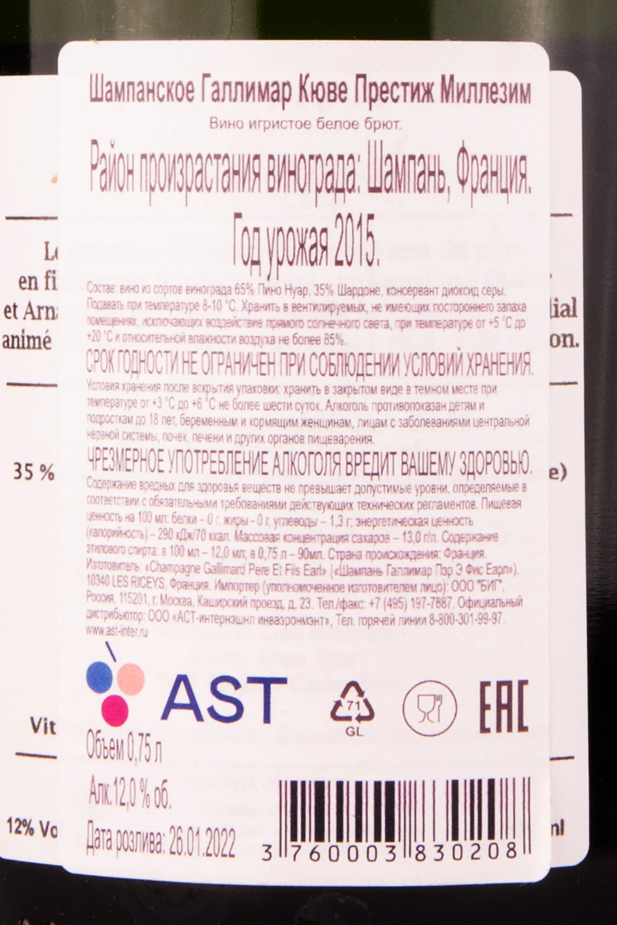 Шампанское Gallimard Pere et Fils Cuvee Prestige Millesime 2015 г. 0.75 l – это элегантный французский алкоголь, изготовленный из урожая 2015 года. Винификация проводится при контролируемой температуре 17 °С, после чего напиток сбраживают в течение 10 месяцев в стальных емкостях и бочках на тонком осадке. Выдержка протекает в бутылке не менее 4-х лет. Готовое белое сухое шампанское имеет крепость 12%, потенциал хранения более 5 лет, а содержание сахара составляет 12 г/л. Напиток на разных дегустационных конкурсах завоевал золотые медали в 2007, 2011 и 2015 годах.