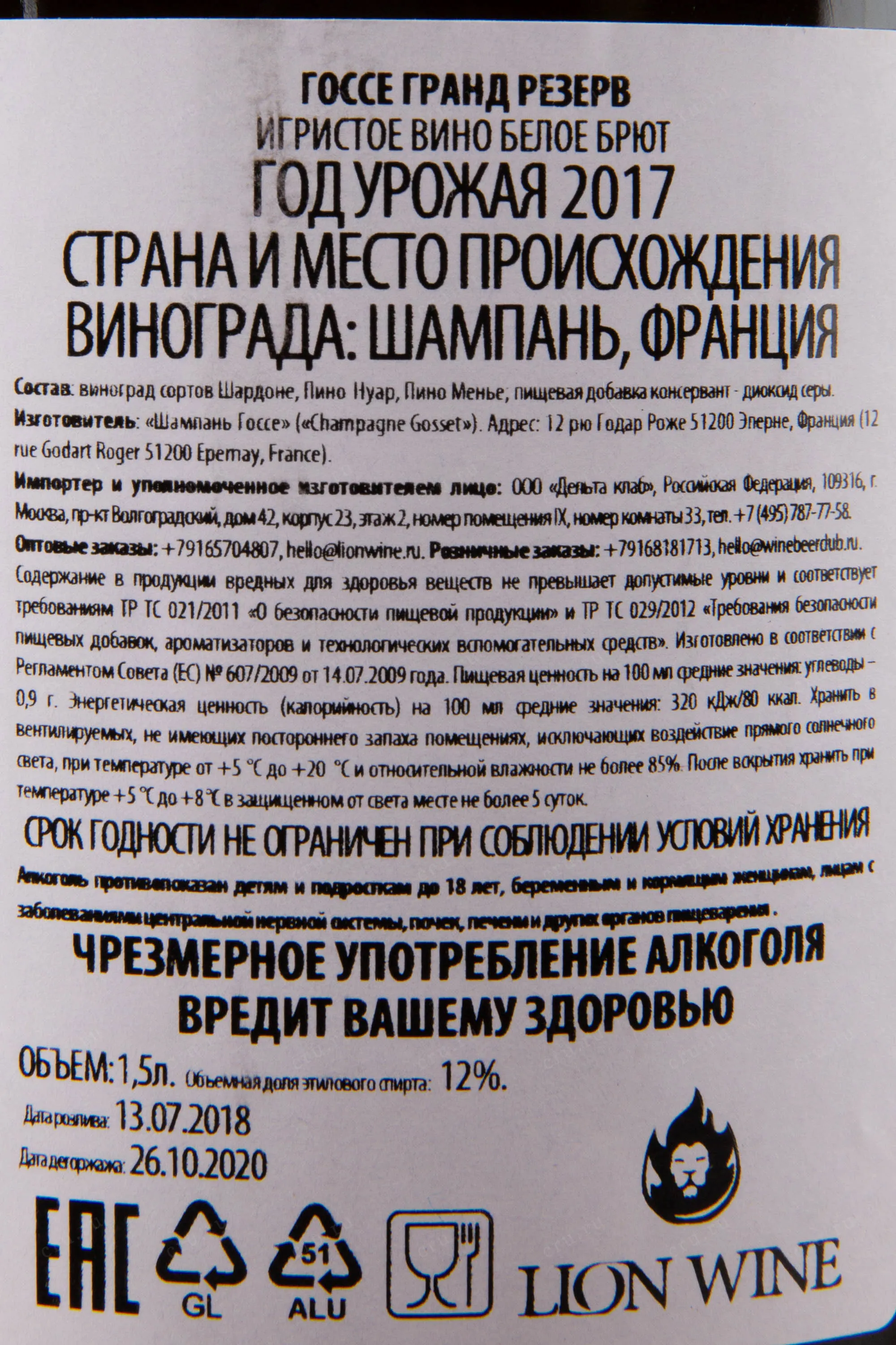 Gosset Grande Reserve 2018 1.5 л купить - шампанское Госсе Гранд Резерв цена в магазине КРЮ ПРОФИ г. Москва, ул. Профсоюзная, д. 16/10 10:00-22:00 Ежедневно +7 (495) 920-20-02 info@cru.ru