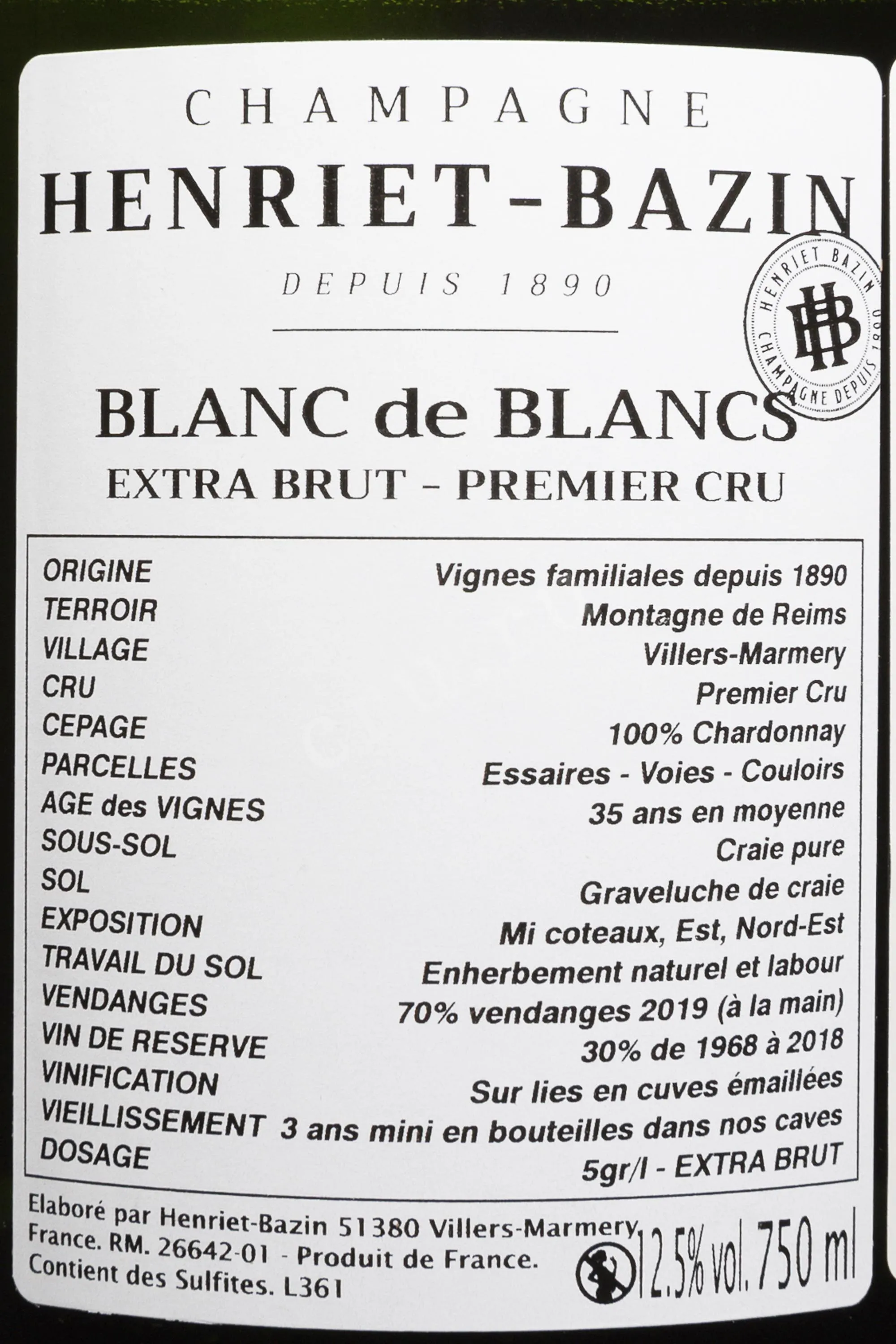 Шампанское Henriet-Bazin Premeier Cru Blanc de Blancs Extra Brut 2019 года 0,75 л создано в элегантном и сдержанном стиле, где чистота сорта Шардоне выходит на первый план. Виноград выращен в Виллер-Мармери, коммуне Монтань де Реймс с классификацией Премье Крю. Здесь гравийно-меловые почвы, восточная и северо-восточная экспозиция склонов дают ягодам высокую кислотность и тонкий аромат. 2019 год был ровным в плане погоды и умеренно тёплым, что позволило получить сырьё с хорошим балансом спелости. В финальный ассамбляж вошёл виноматериал этого года (70%) и часть резервных вин (из урожаев с 1968 года по 2018), выдержанных по системе солера. Виноград был собран вручную. Прессование проводилось мягко. Первичная ферментация проходила в стальных ёмкостях с терморегуляцией. Затем вино выдерживали на осадке около девяти месяцев. Вторичная ферментация протекала в бутылке с последующей трёхлетней выдержкой. Дозировка минимальна, что подчеркивает минеральный характер этого кюве. Оно известно стабильным качеством и высокими оценками от профильных критиков.