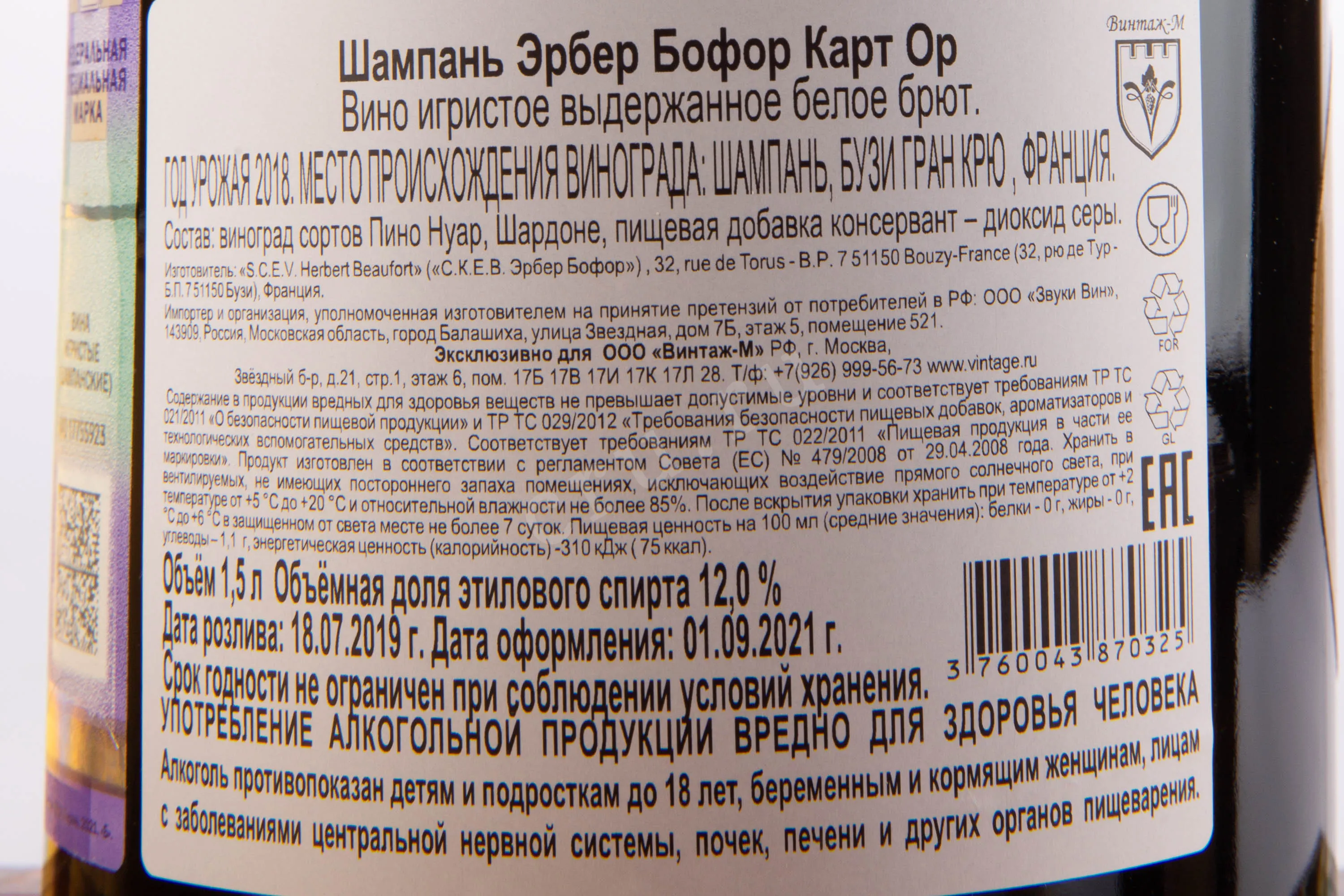 Herbert Beaufort Carte d'Or Bouzy Grand Cru 1.5 л купить - шампанское Эрбер Бофор Карт д'Ор Бузи Гран Крю цена в магазине КРЮ ПРОФИ г. Москва, ул. Профсоюзная, д. 16/10 10:00-22:00 Ежедневно +7 (495) 920-20-02 info@cru.ru