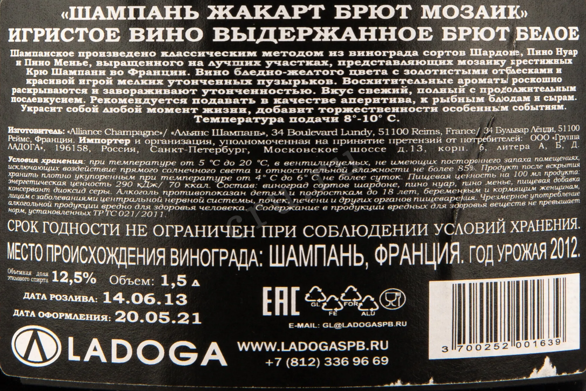 Jacquart Mosaique Brut 1.5 л купить - шампанское Жакарт Брют Мозаик цена в магазине КРЮ ПРОФИ г. Москва, ул. Профсоюзная, д. 16/10 10:00-22:00 Ежедневно +7 (495) 920-20-02 info@cru.ru