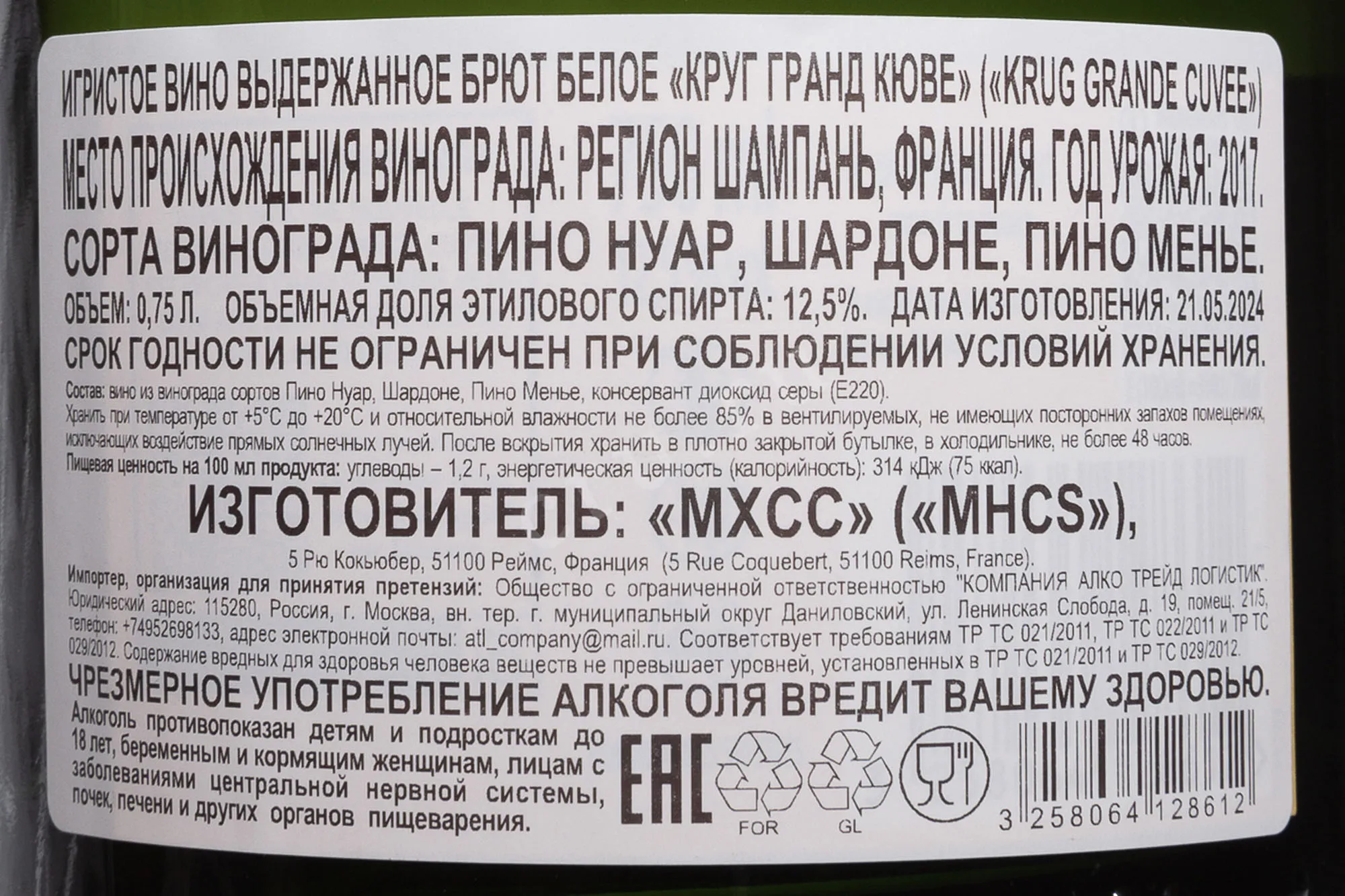 Шампанское Krug Grand Cuvee 2017 года 0,75 л — полное и цельное выражение фирменного стиля дома Круг. Это престижное кюве сочетает глубину вкуса, мощь и свежесть, сохраняя точность и утонченность. Виноград был выращен в регионе Шампань, на разных участках с меловыми и известняковыми почвами, что обеспечивает сложность и баланс будущего вина. 2017 отличался переменчивой погодой, но в целом оказался благоприятным для опытных виноделов, сумевших отобрать качественное сырье. Производство основано на многолетней ассамбляции вин разных лет. Ферментация традиционно проходит в небольших дубовых бочках, что добавляет структуру и объем. После розлива шампанское выдерживается в погребах не менее шести лет, пока не достигает зрелости. Уникальность Круг Гранд Кюве заключается в его стабильном высоком качестве и признании винных критиков (оценки выше 90 баллов от Wine Spectator, Robert Parker, Steven Tanzer's и др.).