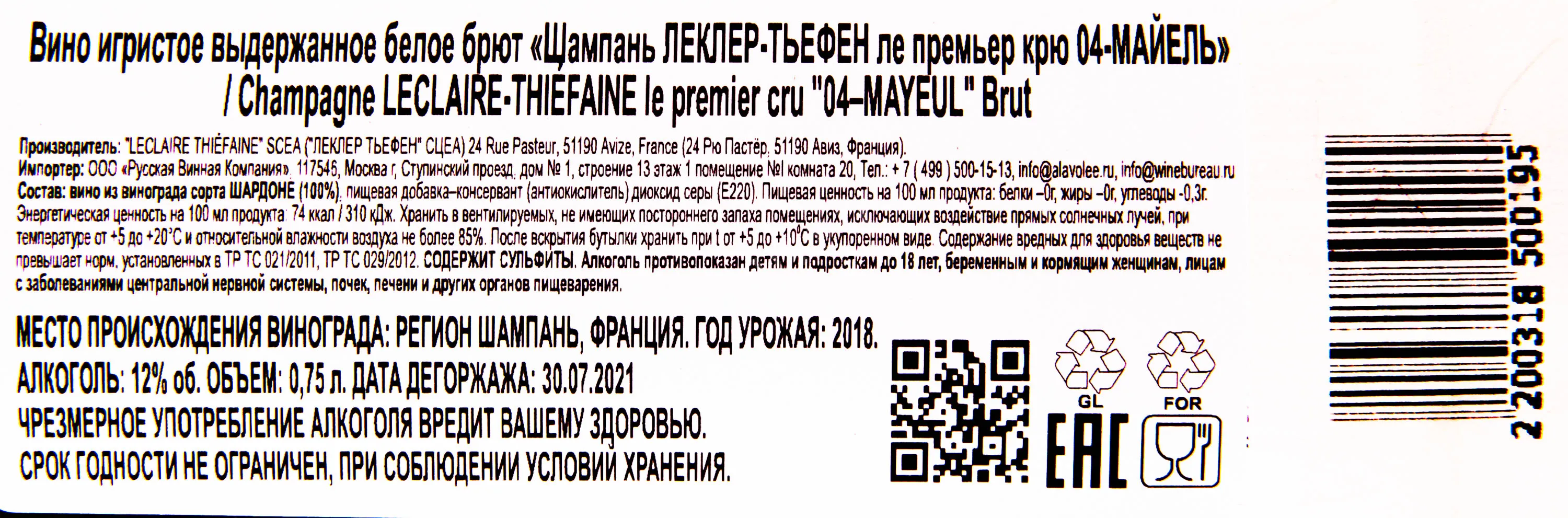 Leclaire-Thiefaine Le Premier Cru 04-Mayeul 2018 0.75 л купить - шампанское Леклер-Тьефен ле премьер 04-Майель цена в магазине КРЮ ПРОФИ г. Москва, ул. Профсоюзная, д. 16/10 10:00-22:00 Ежедневно +7 (495) 920-20-02 info@cru.ru