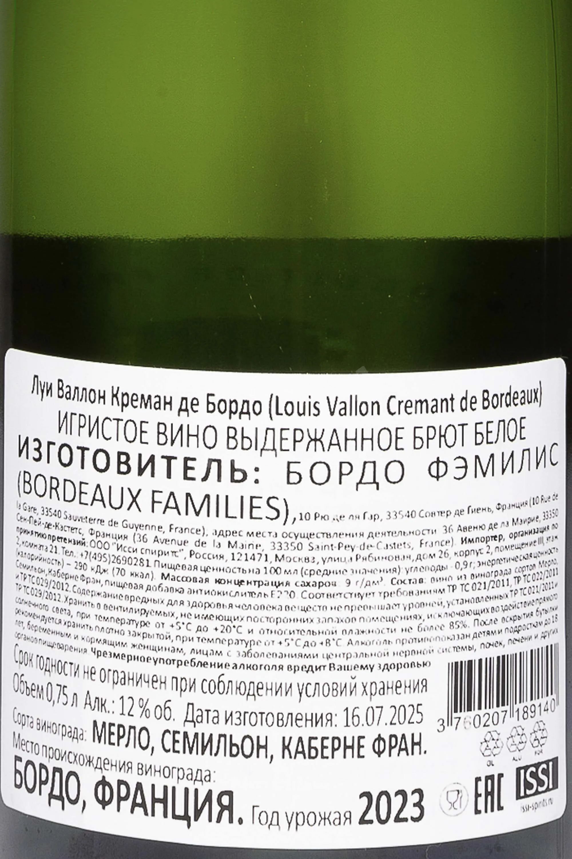 Игристое вино Louis Vallon Cremant de Bordeaux Brut 2023 года 0,75 л — это изысканный креман из региона Бордо, созданный по традиционному методу вторичной ферментации в бутылке. Виноград выращен на известняково-глинистых почвах с умеренным атлантическим климатом, где прохладные ночи и теплые дни обеспечивают оптимальное созревание ягод. 2023 год был благоприятным: сухое лето и мягкая осень позволили сохранить свежесть и аромат винограда. Первичное брожение осуществлялось в стали с контролем температуры. После вторичного брожения игристое вино выдерживали на тонком осадке в бутылке около года. Луи Валлон — один из признанных производителей креманов Бордо, известный стабильным качеством и чистотой стиля. Его продукцию нередко отмечают за сбалансированную кислотность и деликатный вкус, как достойную альтернативу шампанскому.