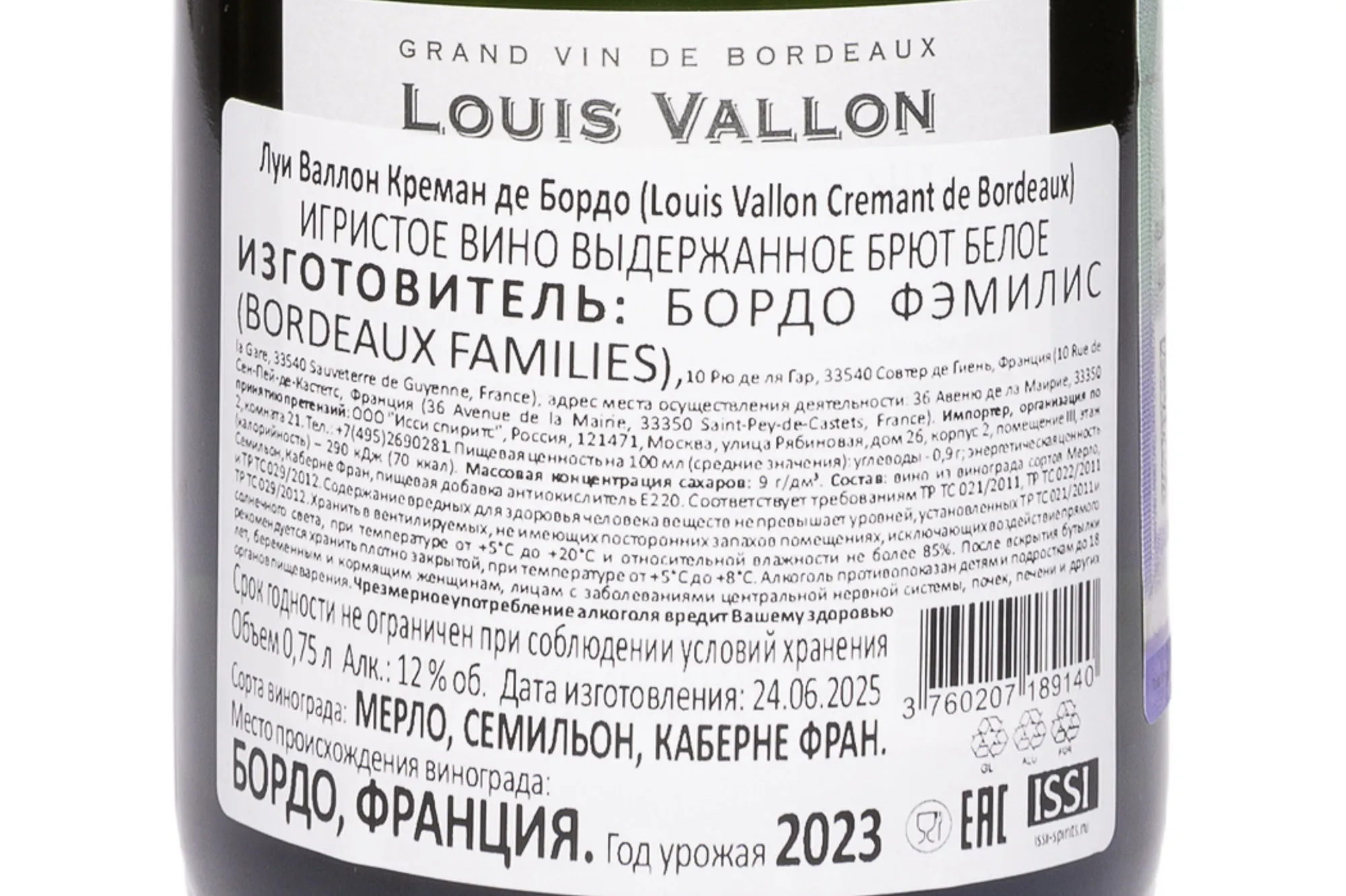 Игристое вино Louis Vallon Cremant de Bordeaux AOC Brut 2023 года 0,75 л создано по классической шампанской технологии, характерной для лучших креманов Франции. Оно производится в регионе Бордо, где умеренный океанический климат и глинисто-известняковые почвы создают идеальные условия для выращивания сортов, используемых для самобытных игристых вин. 2023 год отличился мягкой зимой и тёплым летом с достаточным количеством осадков, что позволило собрать сбалансированный по кислотности и аромату виноград. Вторичная ферментация проходила в бутылке, а выдержка на осадке длилась 12 месяцев, что придало вину характерную кремовую текстуру и утончённые дрожжевые ноты. Луи Валлон Креман де Бордо неоднократно отмечался на международных конкурсах за стабильное качество и выразительный терруарный стиль.