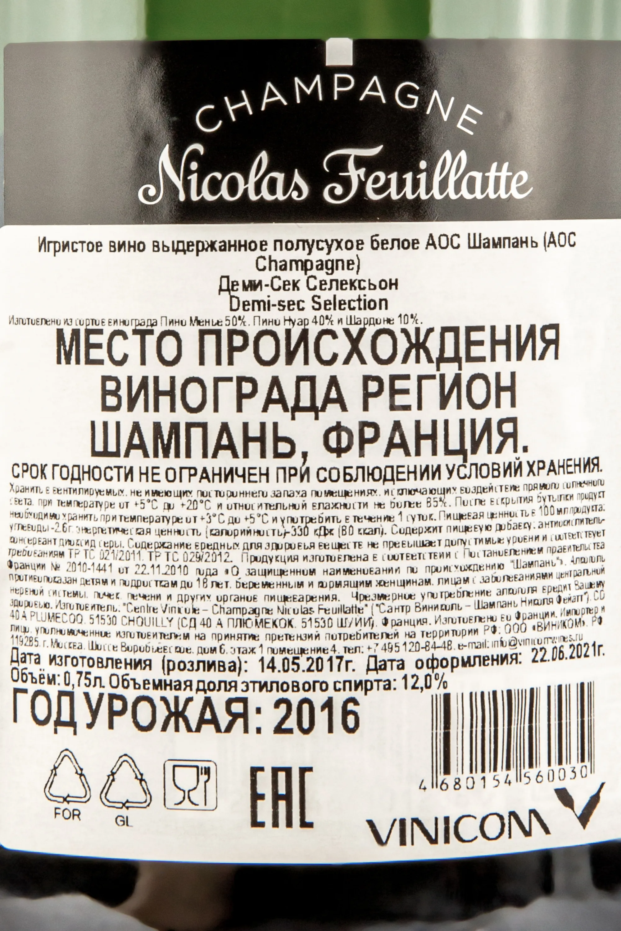 Nicolas Feuillatte Demi-Sec 0.75 л купить - шампанское Николя Фейят Деми-Сек цена в магазине КРЮ ПРОФИ г. Москва, ул. Профсоюзная, д. 16/10 10:00-22:00 Ежедневно +7 (495) 920-20-02 info@cru.ru