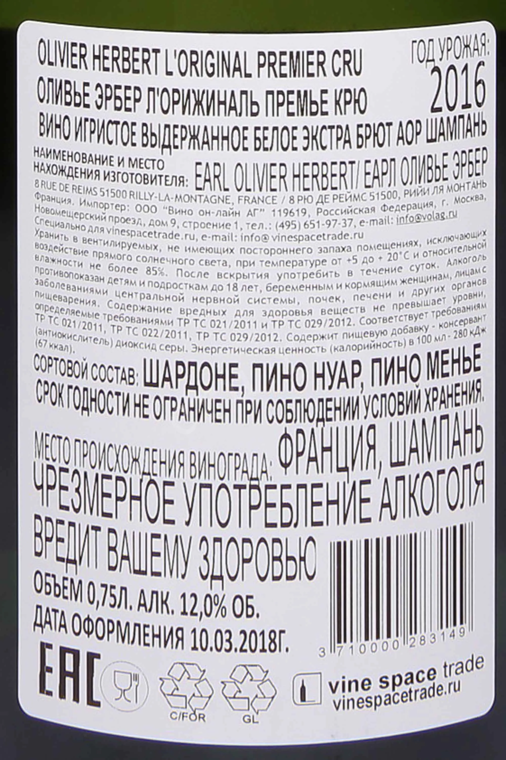 Шампанское белое экстра-брют Olivier Herbert L'Original Premier Cru 2016 г. 0,75 л создано в Монтань-де-Реймс, где виноградники хозяйства расположены на участках категории Премьер Крю. Почвы региона состоят из известняка и мела, что обеспечивает лозам оптимальный дренаж и насыщает ягоды минералами. Сезон был сложным: весна принесла дожди и холод, что снизило объем сбора, однако теплое и сухое лето позволило сохранить концентрацию сахара и кислотность на высоком уровне. Виноделы применили метод шампанизации с длительной выдержкой на осадке не менее 60 месяцев, что придало напитку дополнительную глубину и структуру. Отличие этого кюве в том, что оно производится в ограниченном количестве, без излишней коррекции вкуса, сохраняя естественный характер урожая. Экстра-брют предполагает минимальное добавление экспедиционного ликера, поэтому стиль вина — сухой и насыщенный, с акцентом на чистоту и точность терруара.