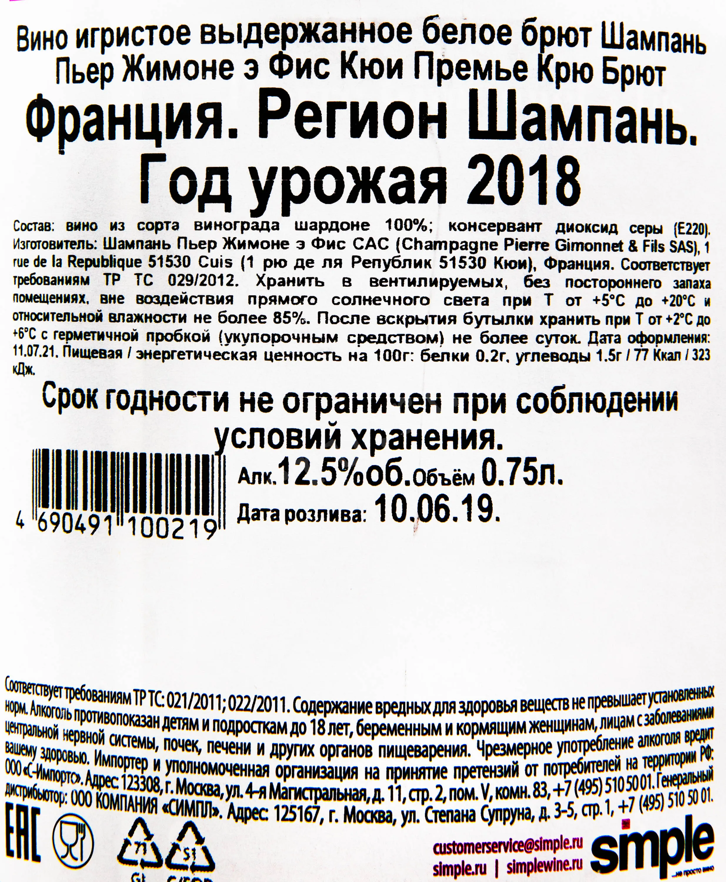 Пьер Жимоне э Фис Кюи Премье Крю 2018 0.75