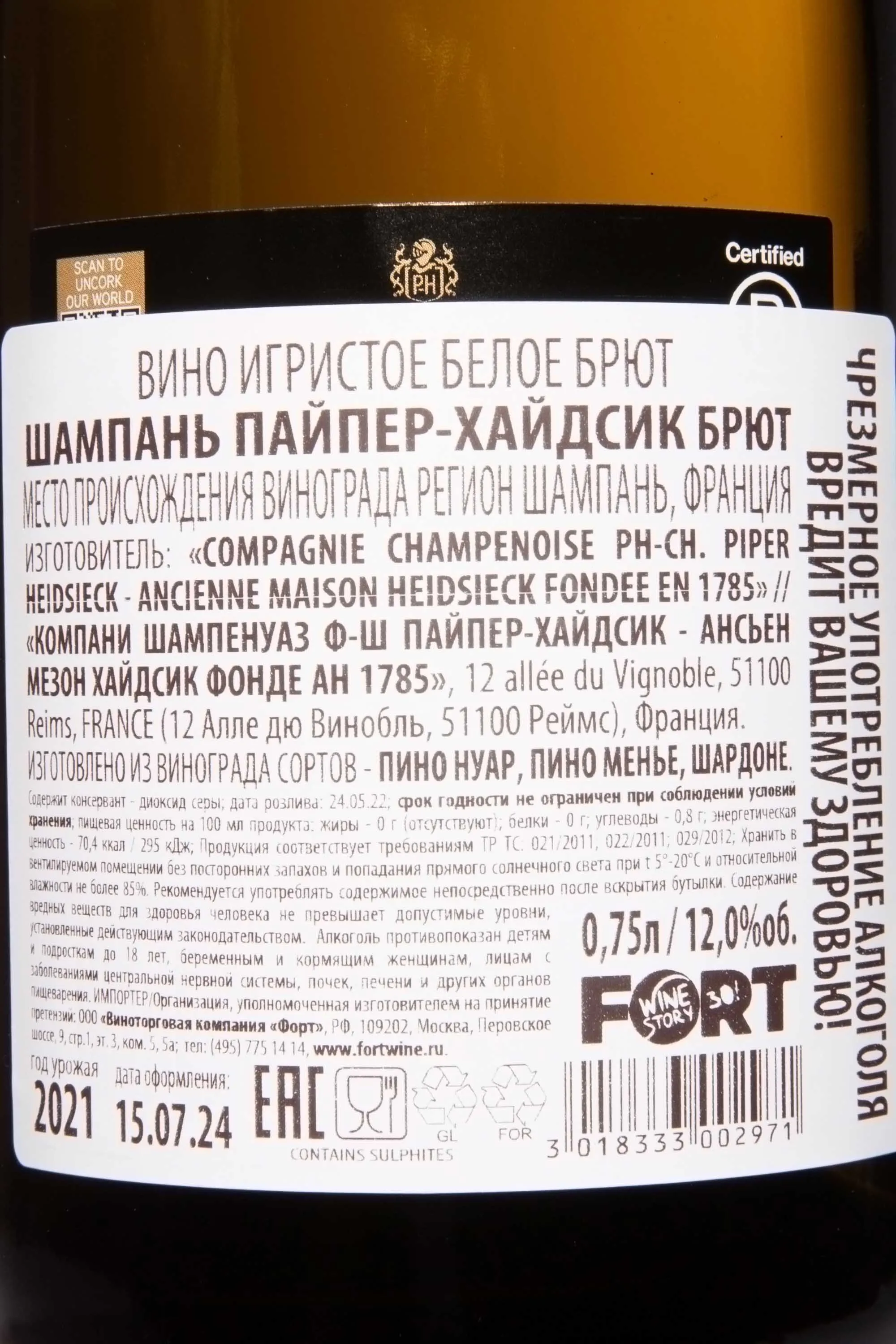 Изготовитель: Компани Шампенауз Ф-Ш Пайпер Хайдсик Ансьен Мезон Хайдсик Фонд