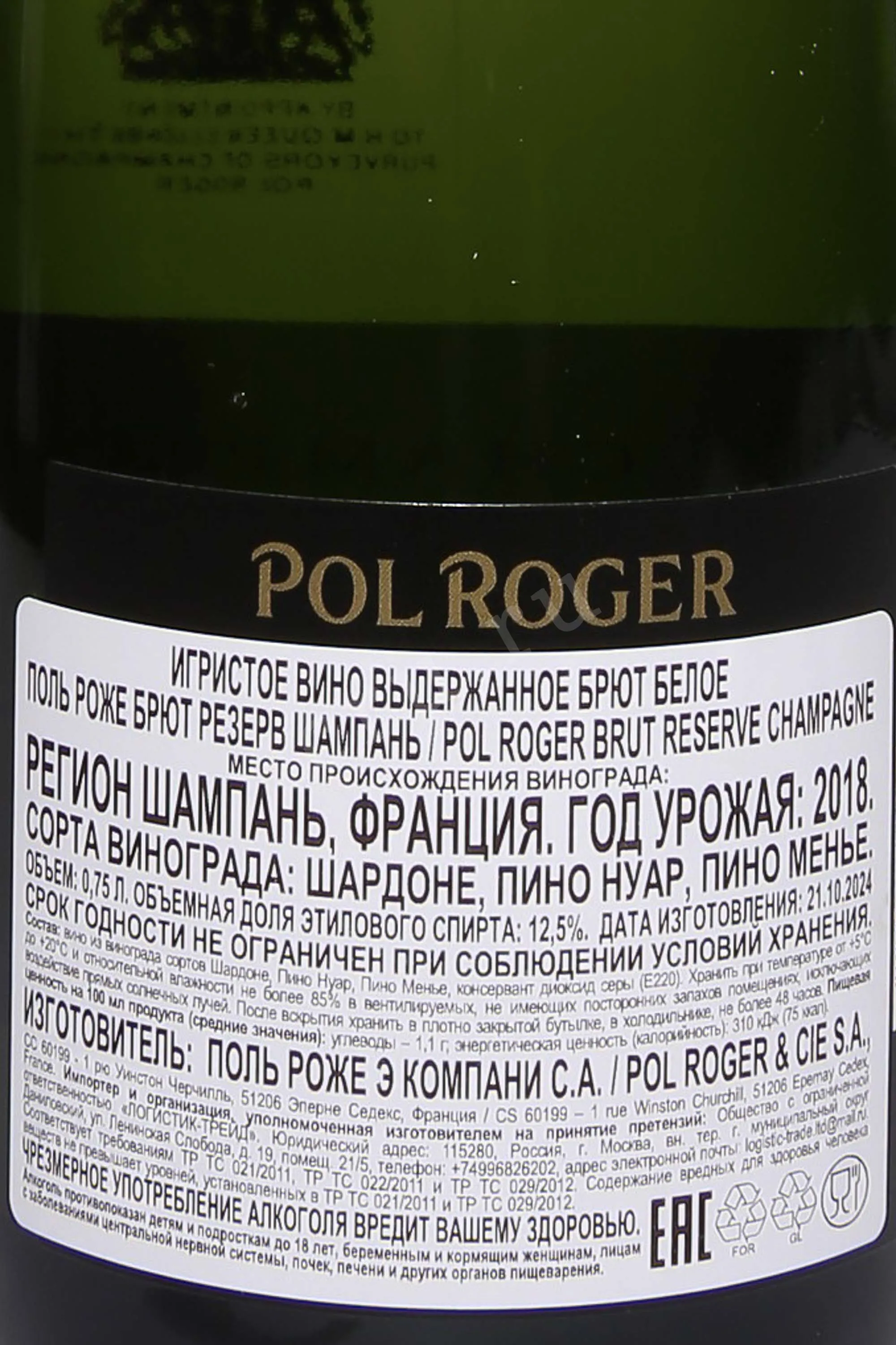 Шампанское Pol Roger Brut Reserve в подарочной упаковке 2018 года 0,75 л — классический брют дома Поль Роже, отражающий традиции региона Шампань. Виноград выращивают на лучших участках Кот-де-Блан, Монтань-де-Реймс и Валле-де-ла-Марн. Почвы здесь меловые, а климат прохладный, с умеренными осадками. 2018 год отличался тёплой весной и солнечным летом. Созревание винограда проходило равномерно, сбор начался рано, качество ягод оценивалось как высокое. В основе купажа — около тридцати базовых вин с разных участков и из разных урожаев лет. Винификация осуществлялась по традиционной схеме шампенуаз. Игристое вино выдерживалось на тонком осадке не менее 3 лет. Его стиль сочетает свежесть и глубину. Белый брют Резерв получил 91/100 баллов от Wine Spectator, 90/100 от Robert Parker и 15,5/20 от Michel Bettane & Thierry Desseauve.