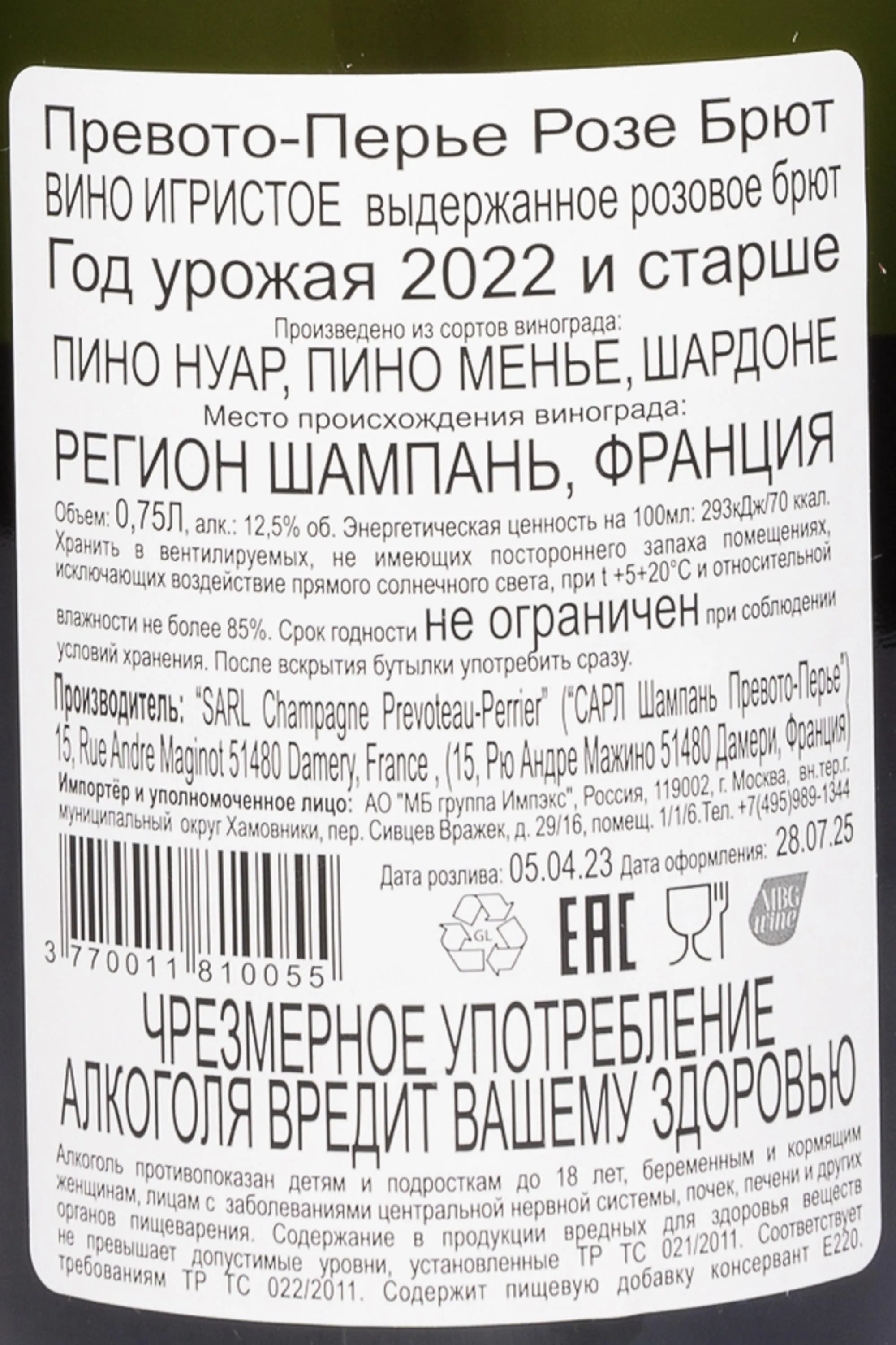 Шампанское Prevoteau-Perrier Rose Brut в подарочной упаковке 0,75 л — изысканное игристое вино из сердца Шампани, воплощающее элегантность и традиции Дома Превото-Перье. Купаж создан из сортов Пино Нуар, Пино Менье и Шардоне, выращенных в терруарах Валле де ля Марн и Кото-Сюд д`Эперне, где известняковые почвы и умеренный климат придают ягодам особую свежесть и ароматную сложность. В производстве используются вина трех урожаев, включая до 9% резерва Пино Нуар со старых лоз, выдержанных в дубовых бочках. После первичной и яблочно-молочной ферментации шампанское выдерживается не менее двух лет на осадке и дополнительно дозревает после дегоржажа. Благодаря такому подходу напиток приобретает мягкость, глубину и изысканный характер. Превото-Перье Розе Брют отмечено серебряной медалью на конкурсе Concours Mondial de Bruxelles, что подтверждает высокий уровень мастерства виноделов.