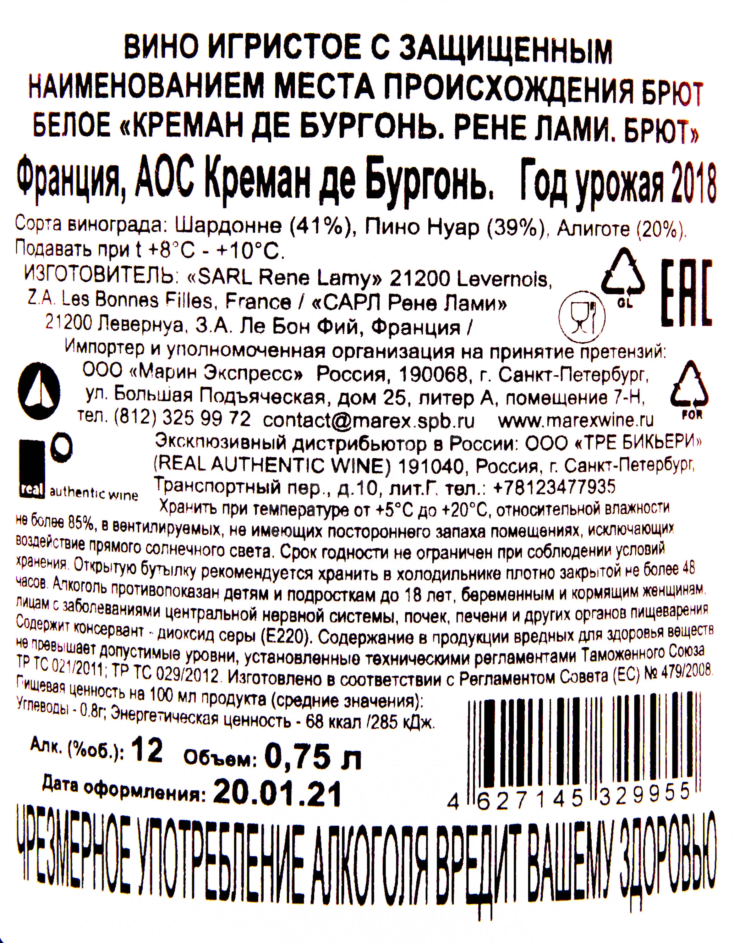 Rene Lamy Cremant de Bourgogne 0.75 л купить - игристое вино Креман де Бургонь Рене Лами цена в магазине КРЮ ПРОФИ г. Москва, ул. Профсоюзная, д. 16/10 10:00-22:00 Ежедневно +7 (495) 920-20-02 info@cru.ru