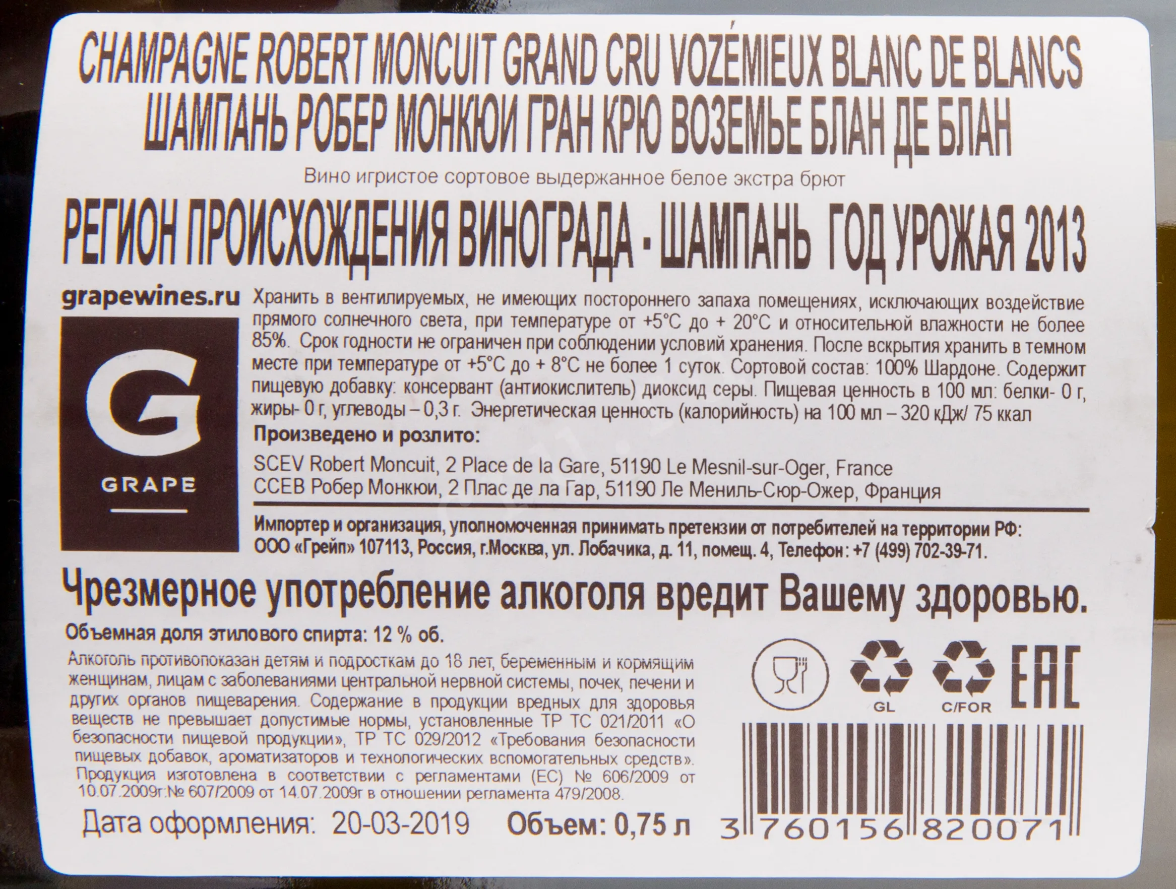 Robert Moncuit Grand Cru Vozemieux Blanc de Blancs Extra Brut 0.75 л купить - шампанское Робер Монкюи Гран Крю Воземье Блан де Блан цена в магазине КРЮ ПРОФИг. Москва, ул. Профсоюзная, д. 16/1010:00-22:00 Ежедневно+7 (495) 920-20-02info@cru.ru