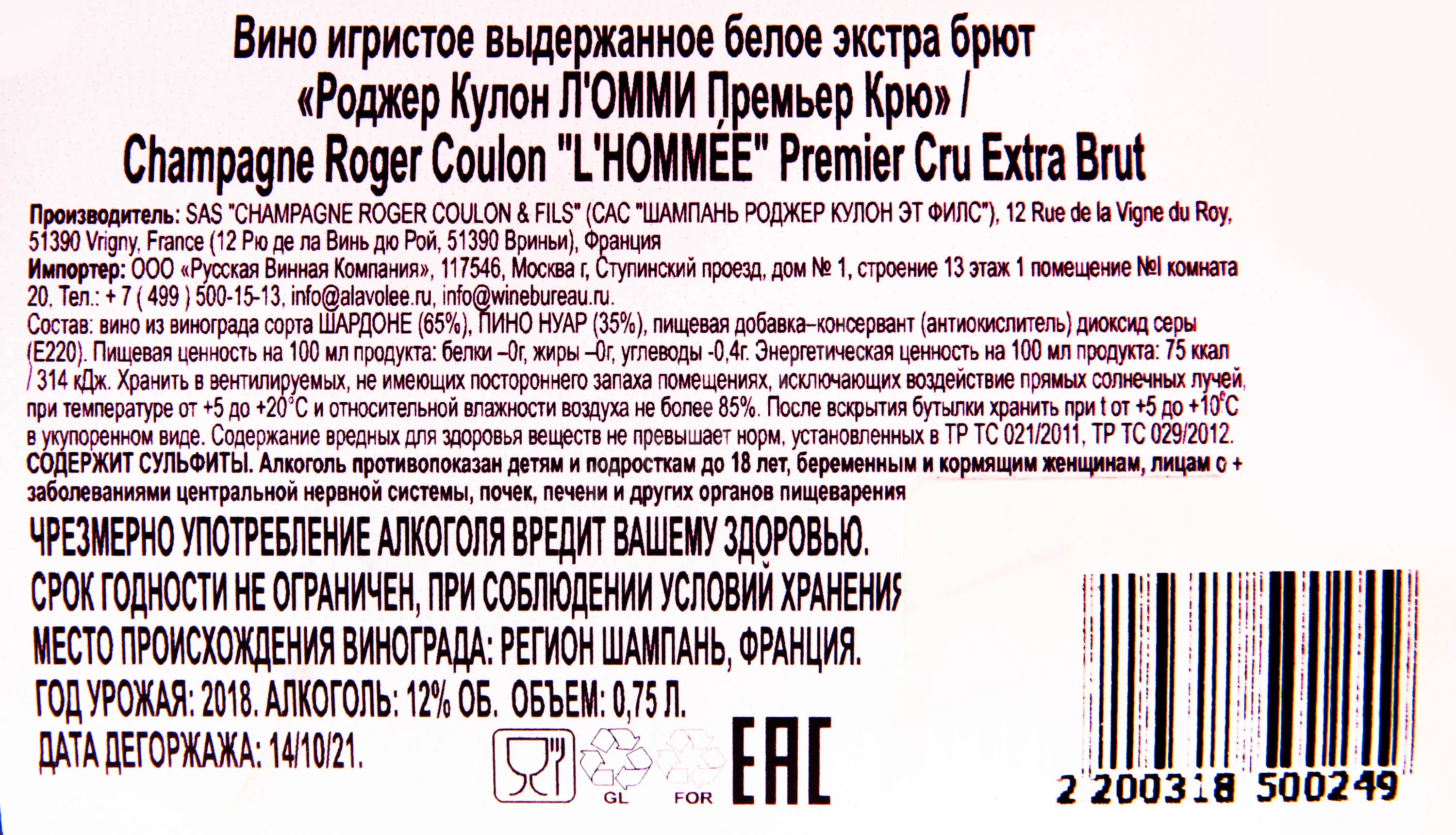 Roger Coulon l'Hommee Premier Cru 0.75 л купить - шампанское Роджер Кулон Л'Омми Премьер Крю цена в магазине КРЮ ПРОФИг. Москва, ул. Профсоюзная, д. 16/1010:00-22:00 Ежедневно+7 (495) 920-20-02info@cru.ru