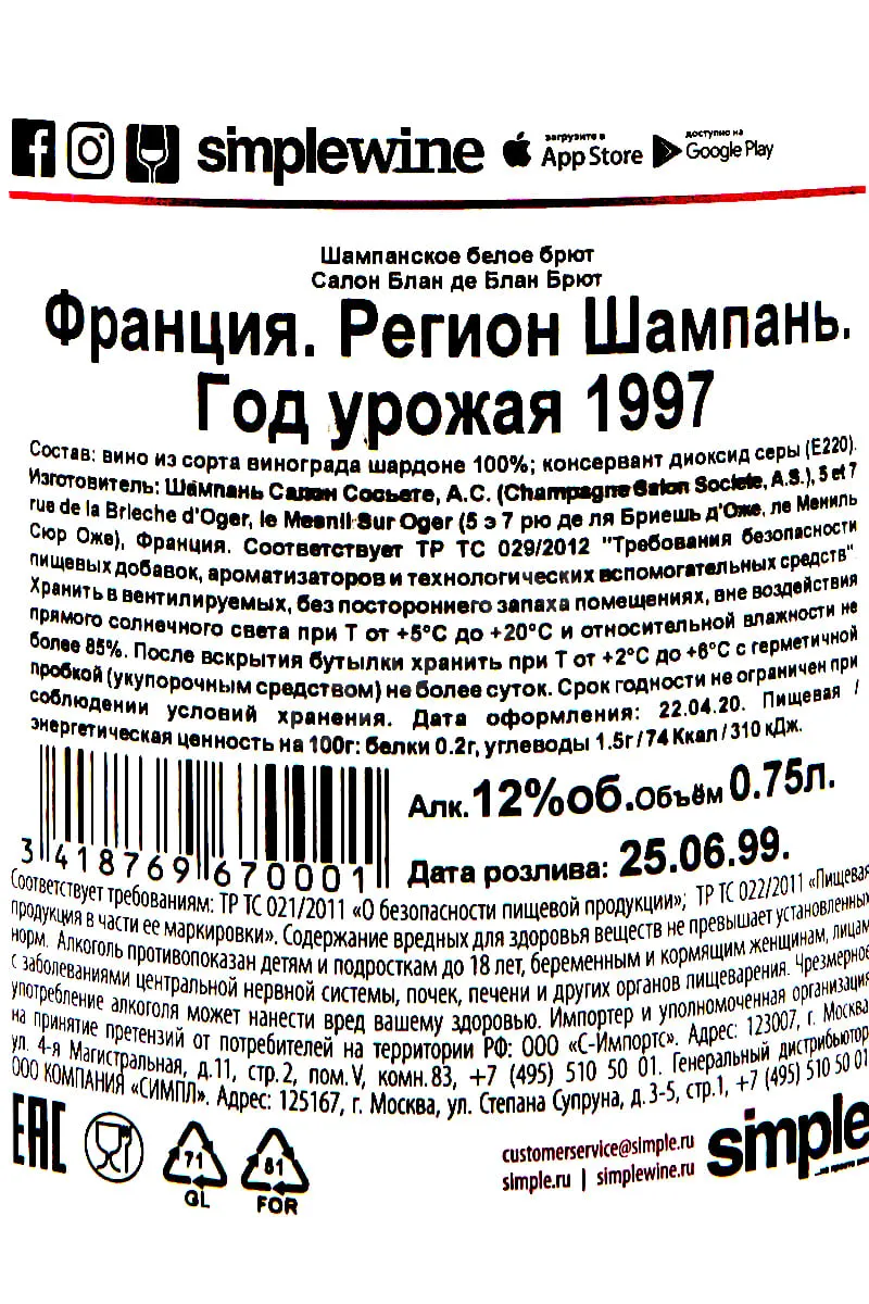 Salon Le Mesnil Blanc de Blancs 1997 0.75 л купить - шампанское Салон Ле Мениль Блан де Блан цена в магазине КРЮ ПРОФИ г. Москва, ул. Профсоюзная, д. 16/10 10:00-22:00 Ежедневно +7 (495) 920-20-02 info@cru.ru
