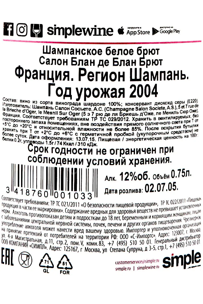 Salon Le Mesnil Blanc de Blancs 2004 0.75 л купить - шампанское Салон Ле Мениль Блан де Блан цена в магазине КРЮ ПРОФИ г. Москва, ул. Профсоюзная, д. 16/10 10:00-22:00 Ежедневно +7 (495) 920-20-02 info@cru.ru