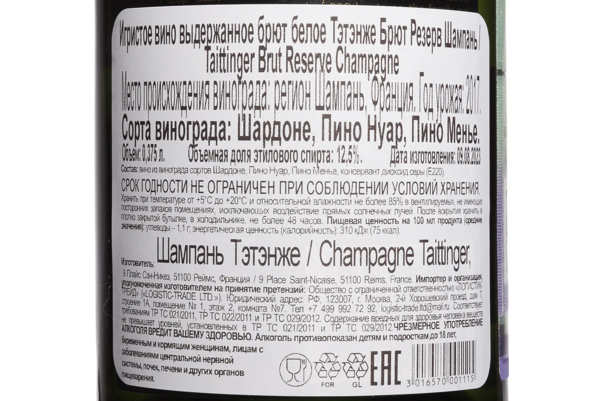 Шампанское белое Taittinger Brut Reserve 2017 г. 0,375 л родился в исторических погребах Реймса, где выдержка и строгий отбор виноматериалов формируют фирменный стиль дома Тэтэнжэ. Урожай собрали на участках с меловыми почвами, которые придают напиткам минеральность и чистоту. Для создания кюве использовали базовые вина из нескольких коммун, выбирая партии с наибольшей свежестью и точностью аромата. Брожение проходило при контролируемой температуре сначала в стали, затем — в бутылках, а последующая выдержка на осадке длилась дольше минимальных требований аппелласьона.